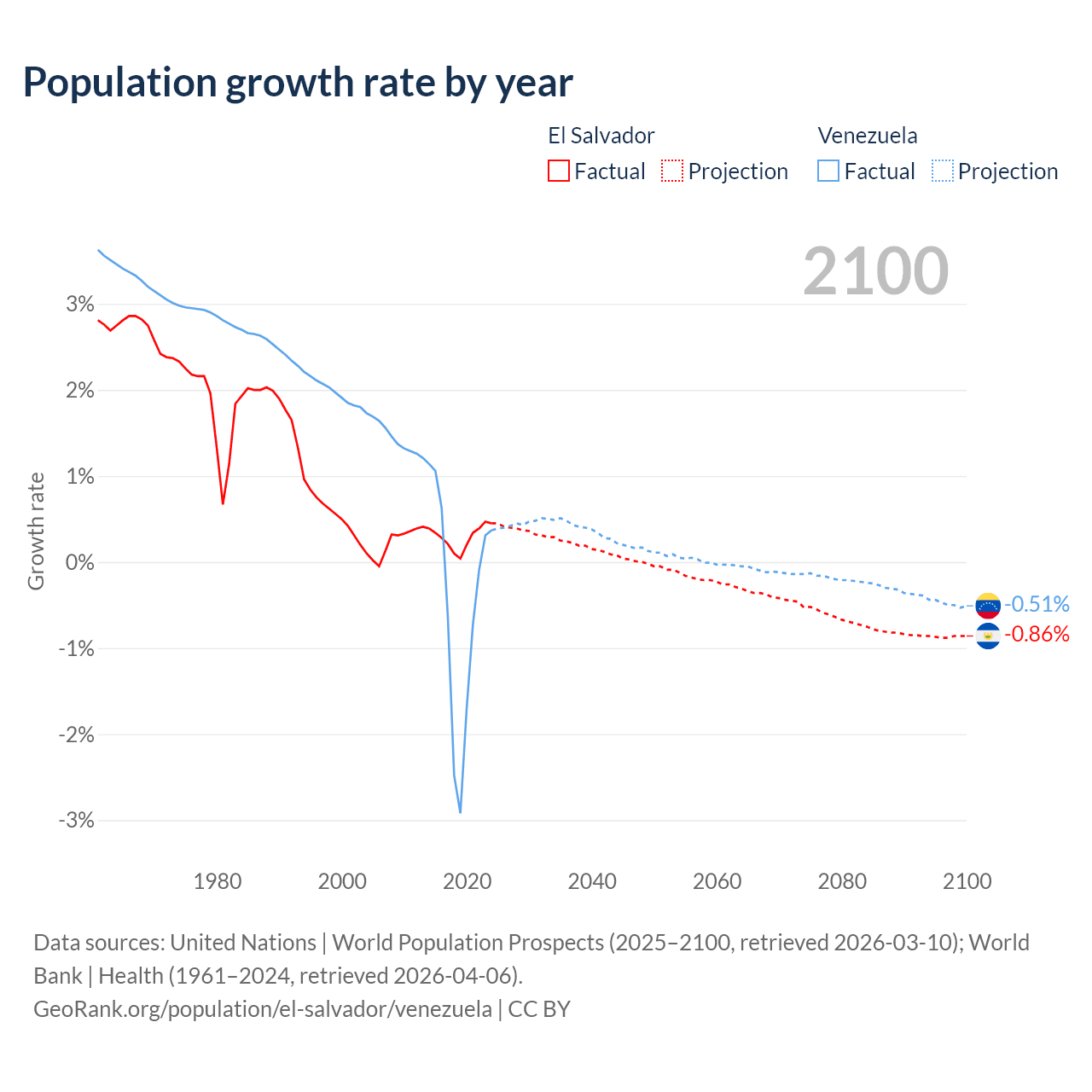 - For the last 10 years, El Salvador has had an average growth rate of +0.29% per year vs -0.46% in Venezuela.