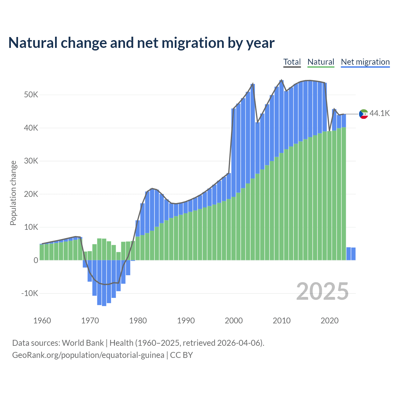 Over the last 10 years, 77% of the population change in Equatorial Guinea is from natural causes (a gain of 382,745 people) and 23% is from migration (a gain of 114,024 people).