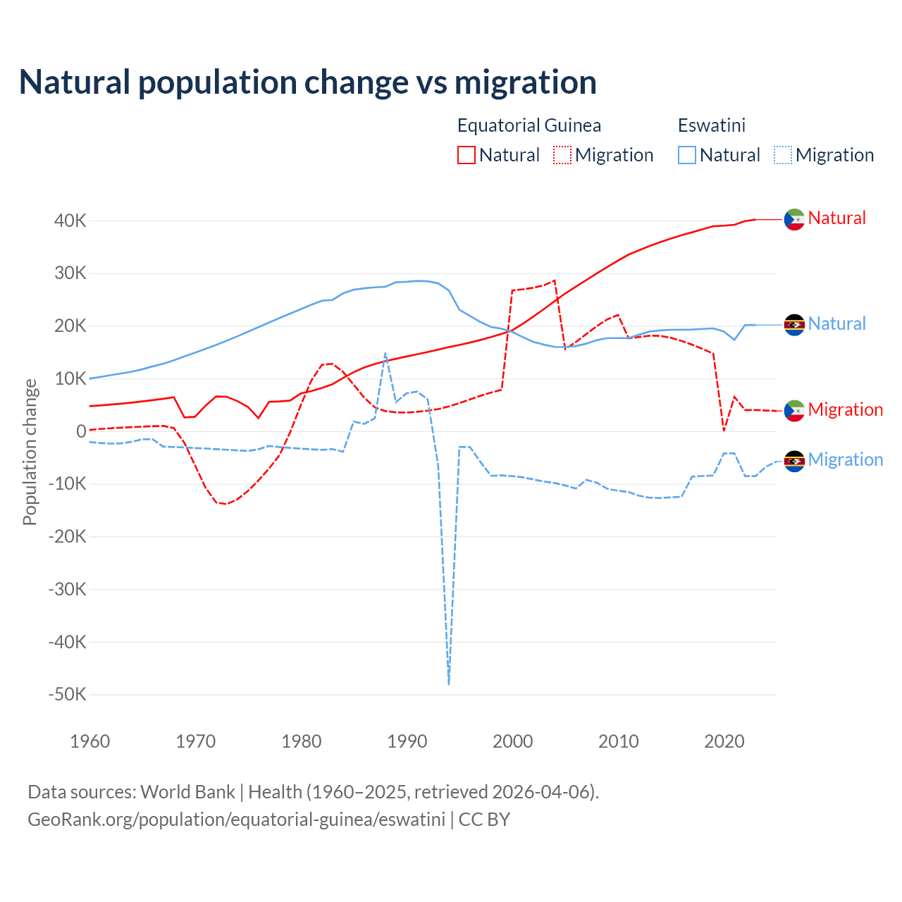 Over the last 10 years, 77% of the population change in Equatorial Guinea is from natural causes (a gain of 382,745 people) and 23% is from migration (a gain of 114,024 people). In Eswatini 68.3% is from natural causes (a gain of 192,206 people) and 31.7% is from migration (a loss of 89,012 people).