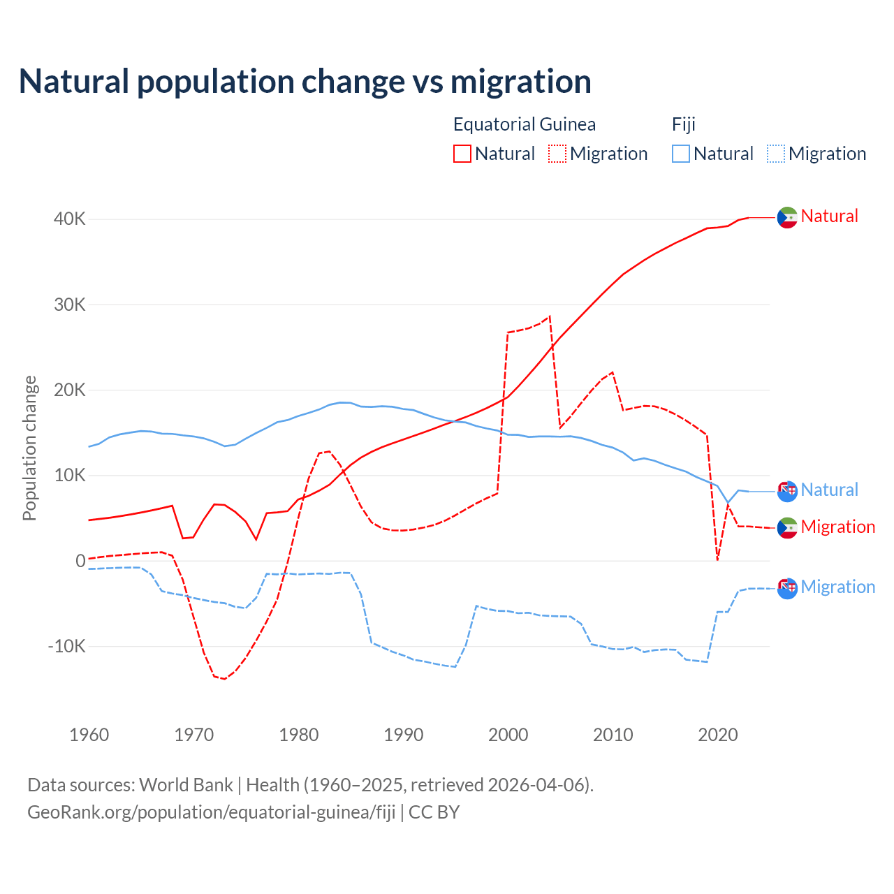 Over the last 10 years, 77% of the population change in Equatorial Guinea is from natural causes (a gain of 382,745 people) and 23% is from migration (a gain of 114,024 people). In Fiji 52.6% is from natural causes (a gain of 94,971 people) and 47.4% is from migration (a loss of 85,415 people).