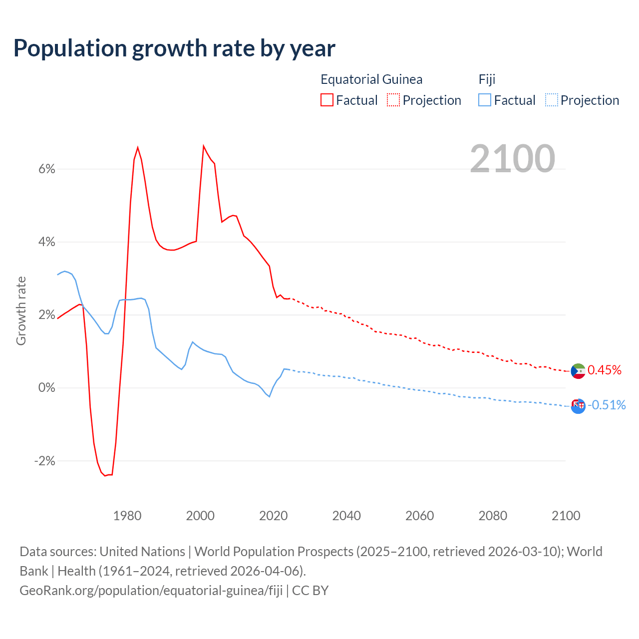 - For the last 10 years, Equatorial Guinea has had an average growth rate of +3.15% per year vs +0.12% in Fiji.