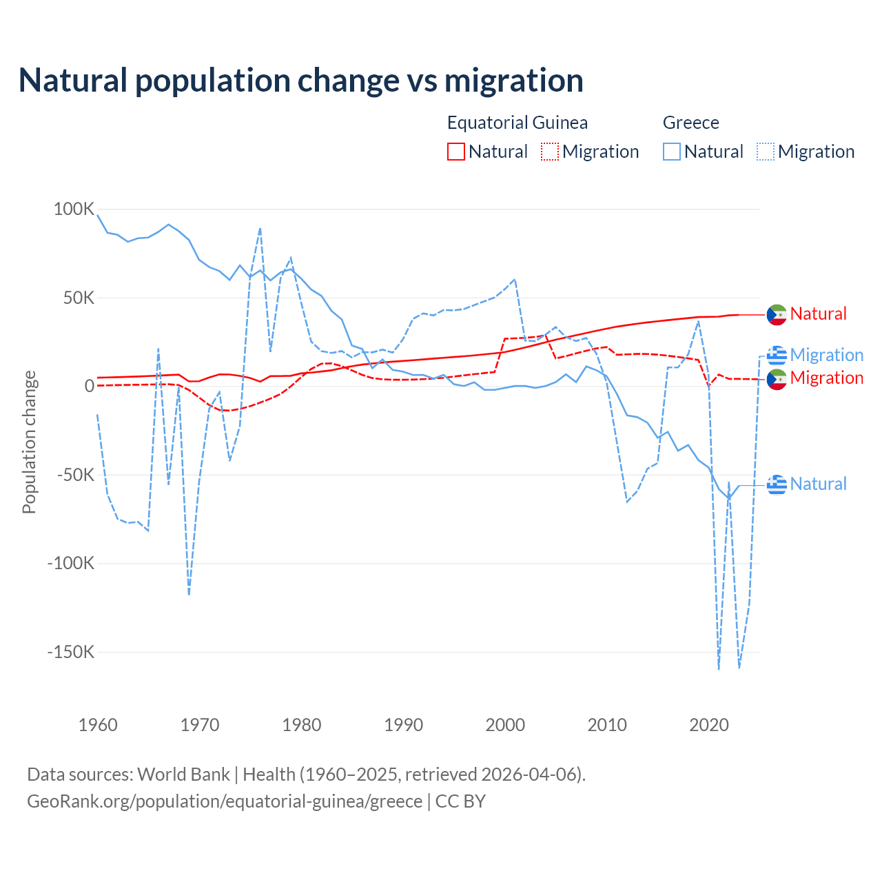 Over the last 10 years, 77% of the population change in Equatorial Guinea is from natural causes (a gain of 382,745 people) and 23% is from migration (a gain of 114,024 people). In Greece 51.9% is from natural causes (a loss of 411,426 people) and 48.1% is from migration (a loss of 381,824 people).
