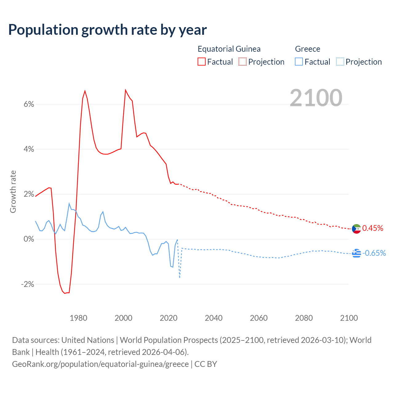 Data sources: World Bank | Health (1960–2024, retrieved 2026-04-06); United Nations | World Population Prospects (1960–2026, retrieved 2026-03-10); U.S. Census Bureau (1960–2025, retrieved 2026-02-08); Central Intelligence Agency (CIA) (2000–2019, retrieved 2026-02-20).