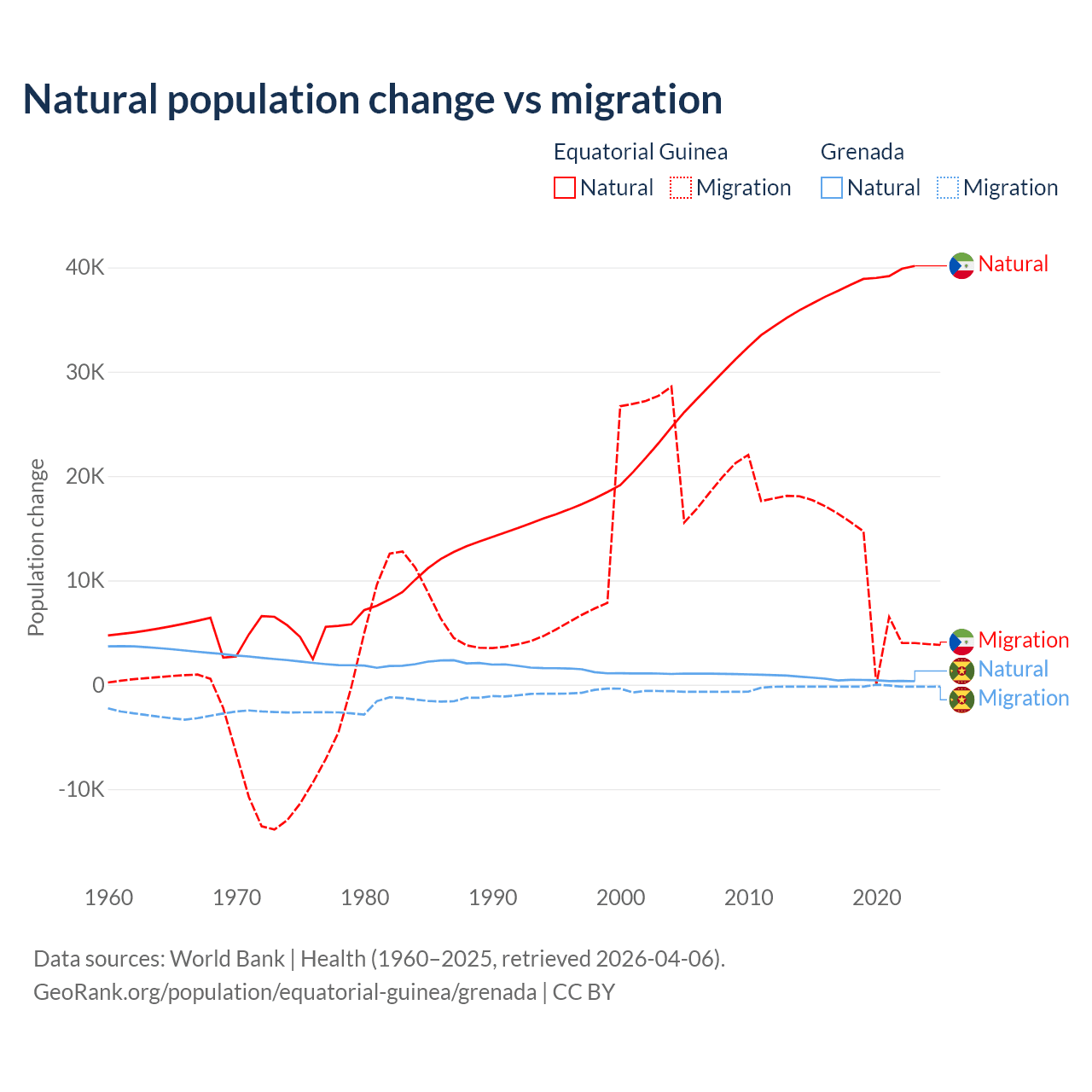 Over the last 10 years, 77% of the population change in Equatorial Guinea is from natural causes (a gain of 382,745 people) and 23% is from migration (a gain of 114,024 people). In Grenada 76% is from natural causes (a gain of 4,850 people) and 24% is from migration (a loss of 1,535 people).