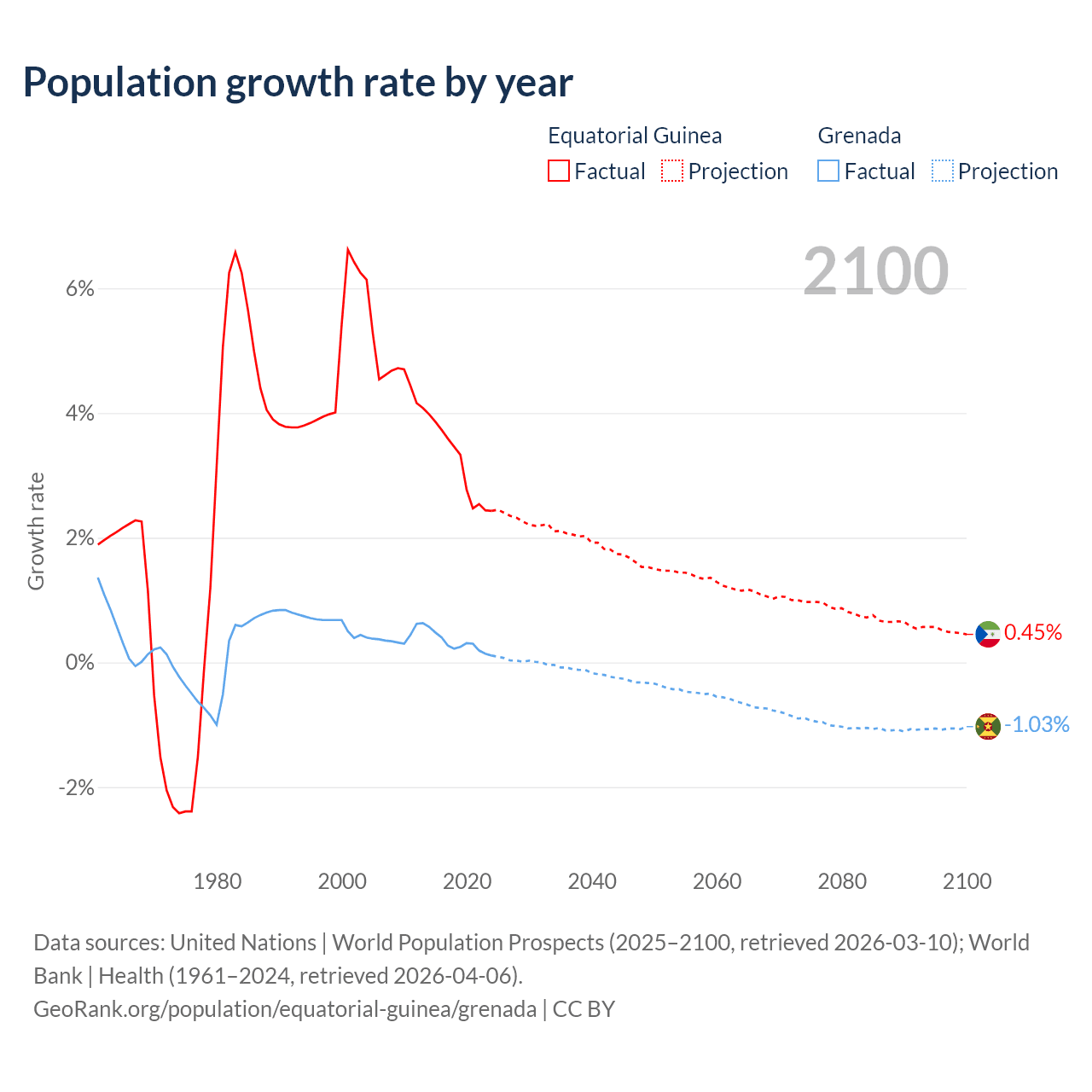 - For the last 10 years, Equatorial Guinea has had an average growth rate of +3.15% per year vs +0.29% in Grenada.