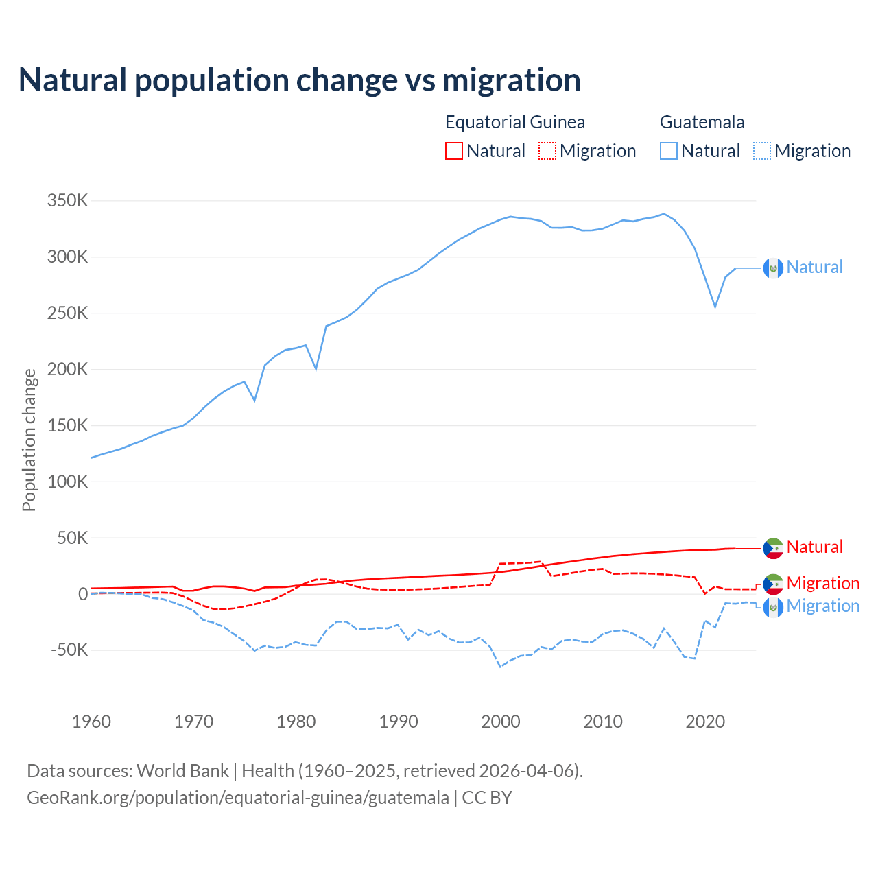 Over the last 10 years, 77% of the population change in Equatorial Guinea is from natural causes (a gain of 382,745 people) and 23% is from migration (a gain of 114,024 people). In Guatemala 89.8% is from natural causes (a gain of 3,077,847 people) and 10.2% is from migration (a loss of 347,818 people).