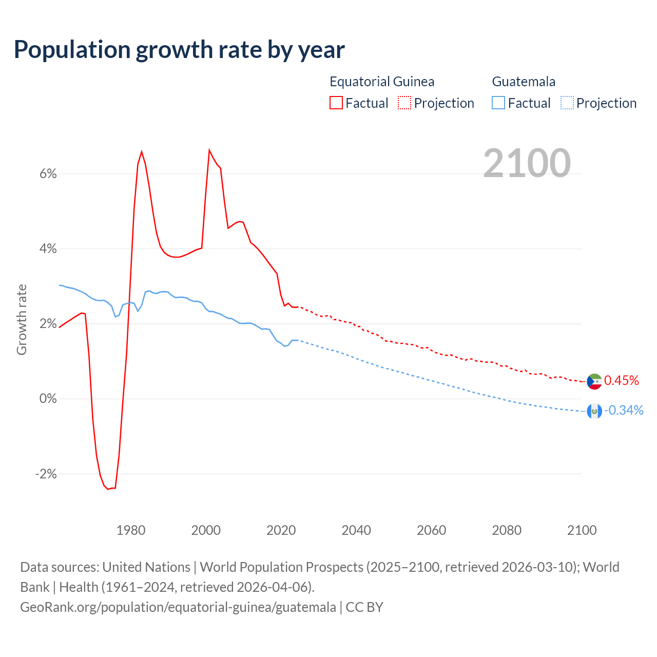 - For the last 10 years, Equatorial Guinea has had an average growth rate of +3.15% per year vs +1.64% in Guatemala.