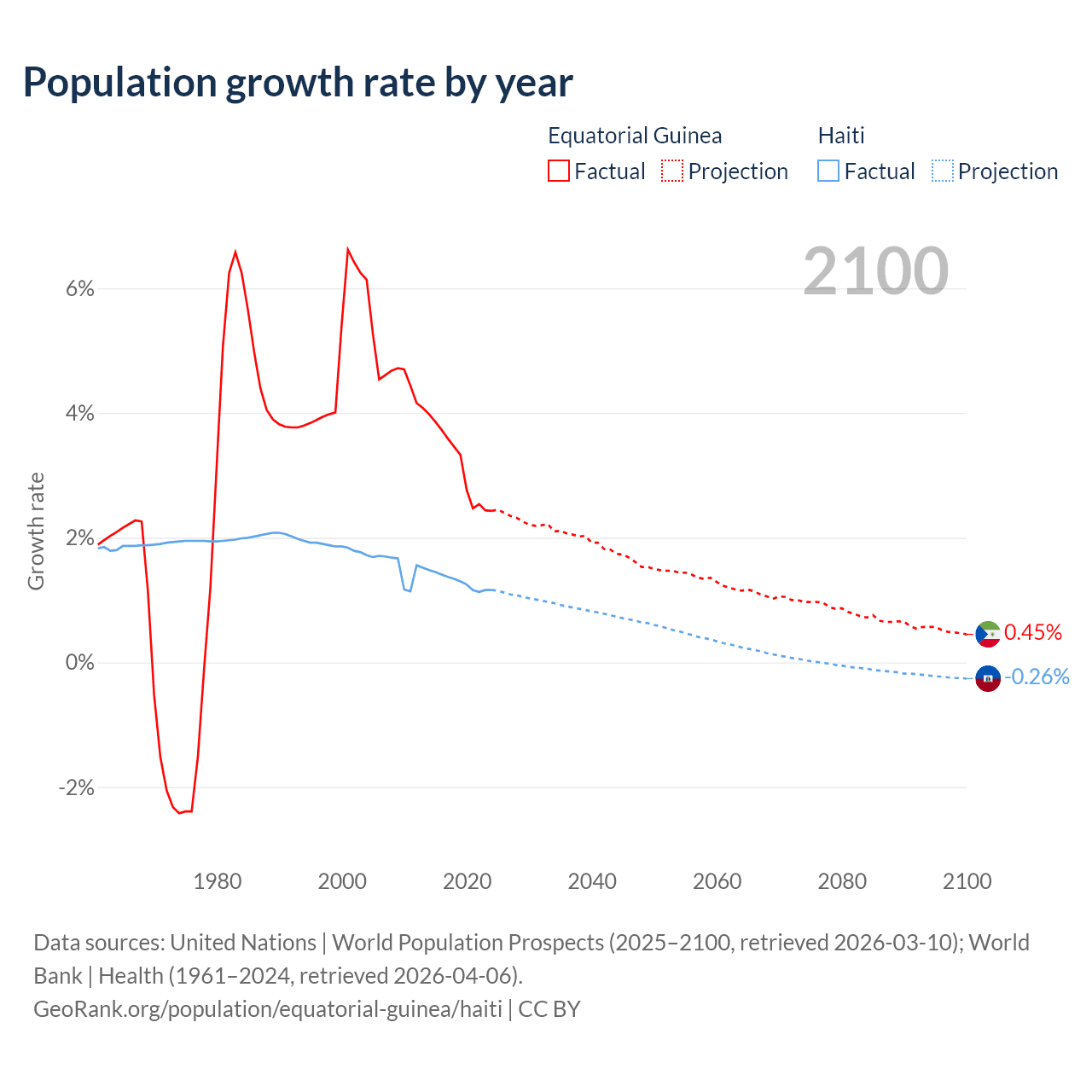 - For the last 10 years, Equatorial Guinea has had an average growth rate of +3.15% per year vs +1.29% in Haiti.