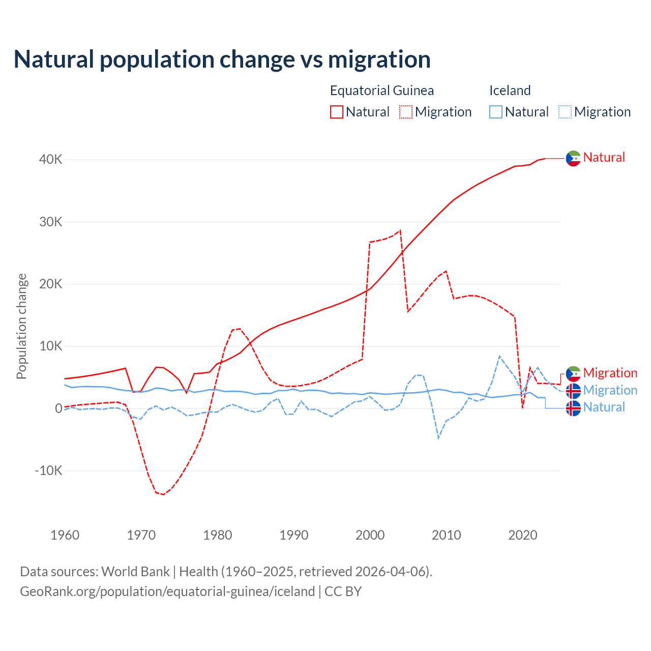Over the last 10 years, 77% of the population change in Equatorial Guinea is from natural causes (a gain of 382,745 people) and 23% is from migration (a gain of 114,024 people). In Iceland 30.7% is from natural causes (a gain of 20,128 people) and 69.3% is from migration (a gain of 45,356 people).