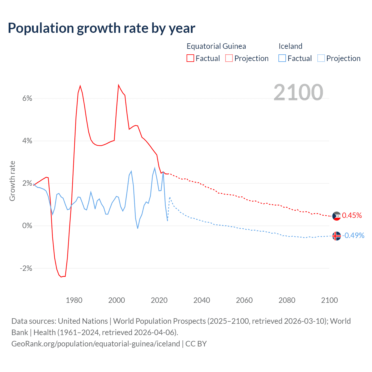 - For the last 10 years, Equatorial Guinea has had an average growth rate of +3.15% per year vs +1.63% in Iceland.
