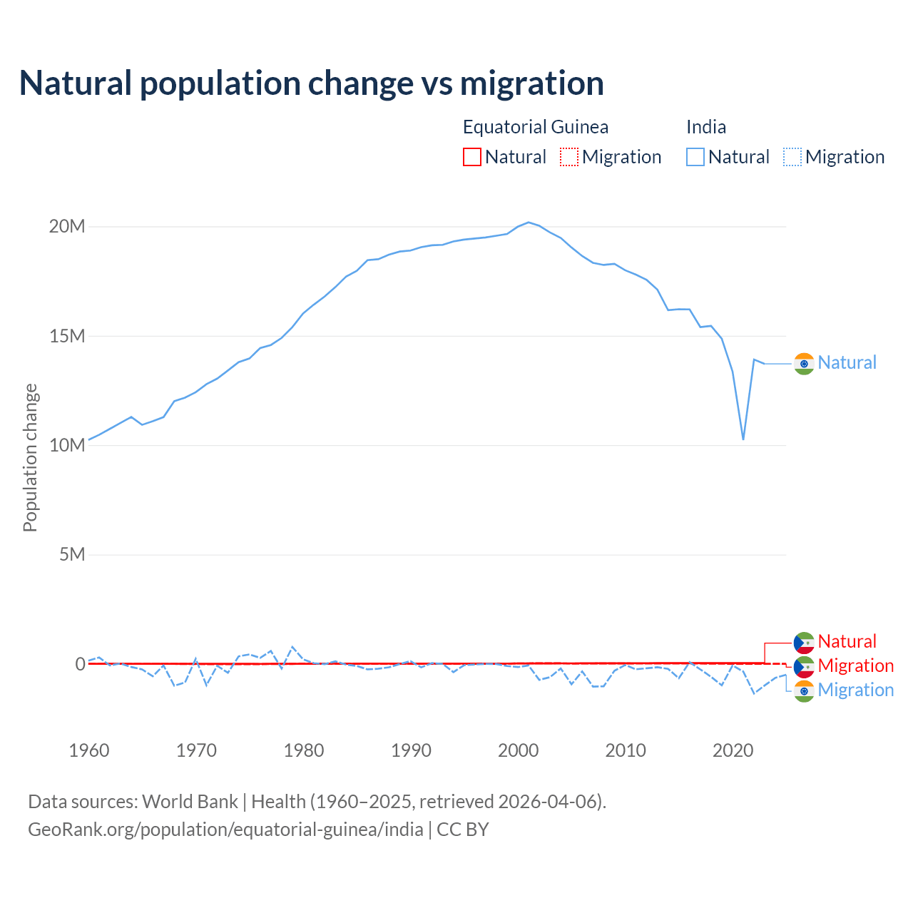 Over the last 10 years, 77% of the population change in Equatorial Guinea is from natural causes (a gain of 382,745 people) and 23% is from migration (a gain of 114,024 people). In India 96.4% is from natural causes (a gain of 145,503,378 people) and 3.56% is from migration (a loss of 5,376,884 people).