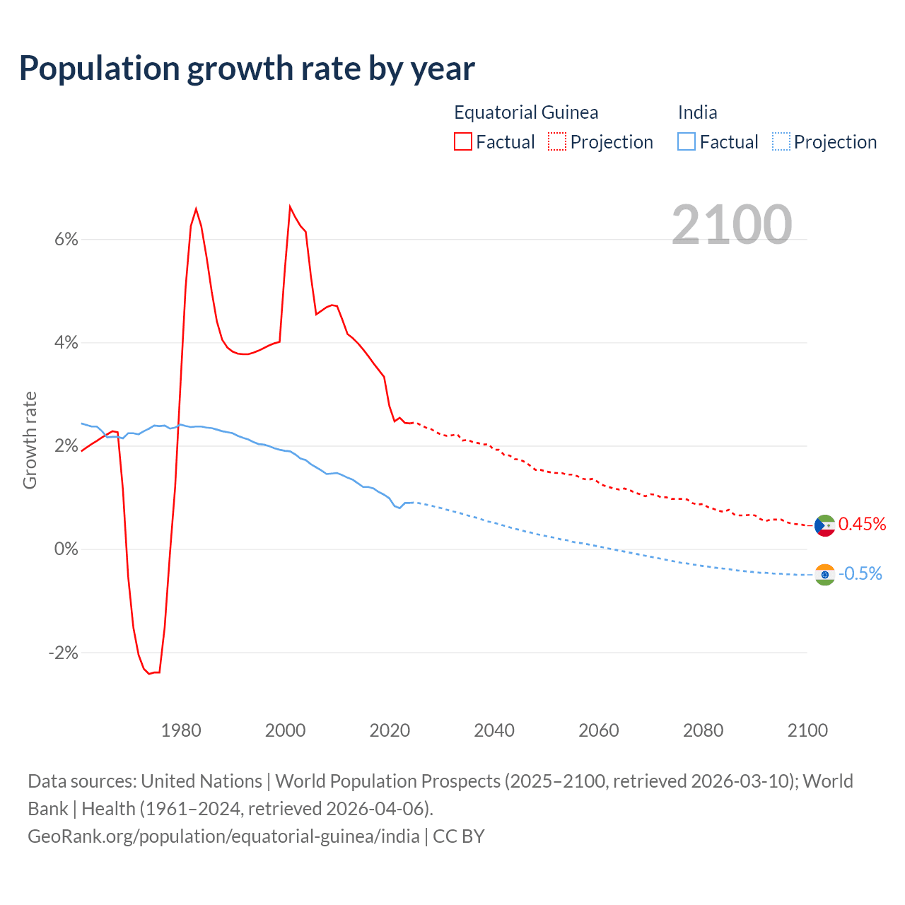 - For the last 10 years, Equatorial Guinea has had an average growth rate of +3.15% per year vs +1.03% in India.