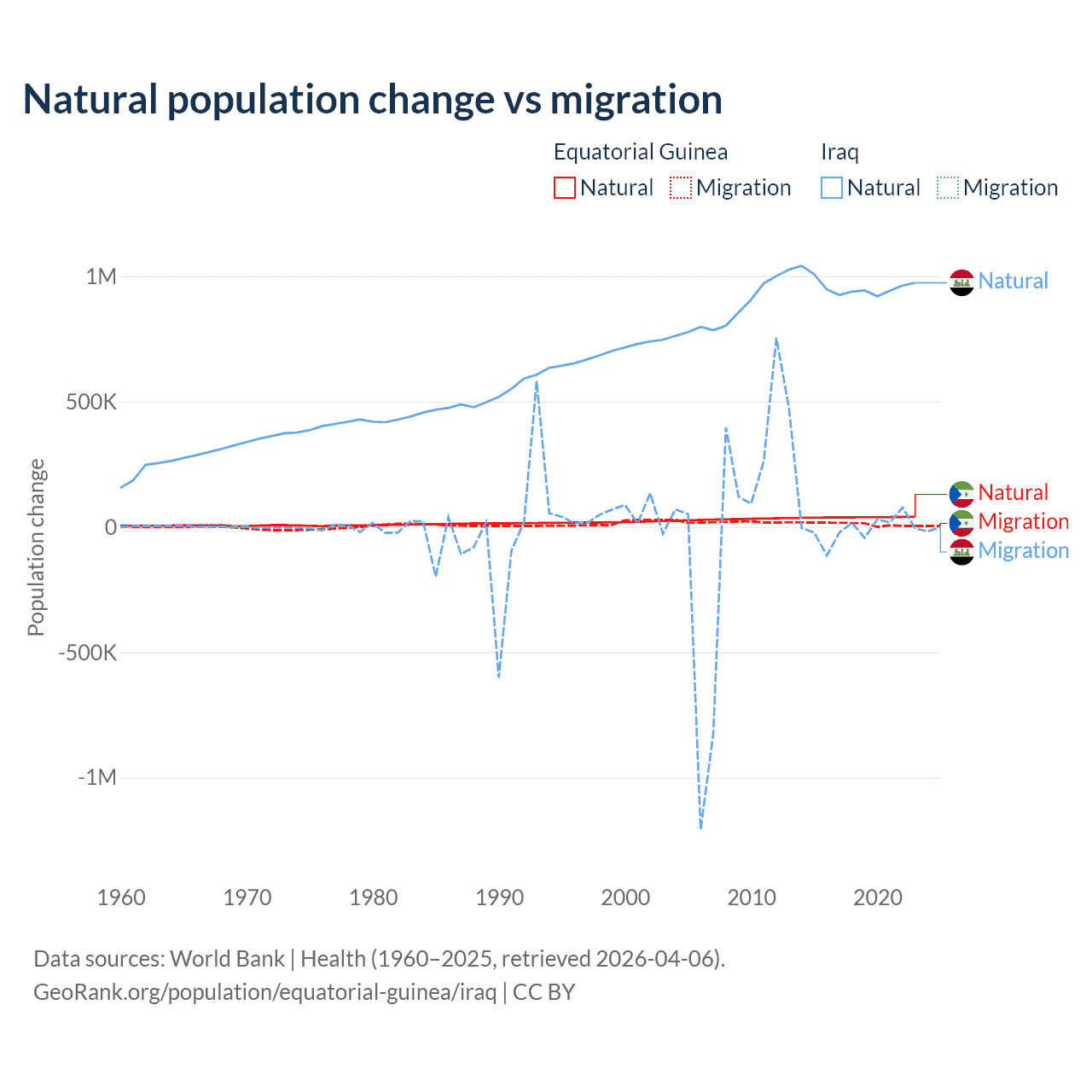 Over the last 10 years, 77% of the population change in Equatorial Guinea is from natural causes (a gain of 382,745 people) and 23% is from migration (a gain of 114,024 people). In Iraq 99.2% is from natural causes (a gain of 9,598,842 people) and 0.76% is from migration (a loss of 73,050 people).