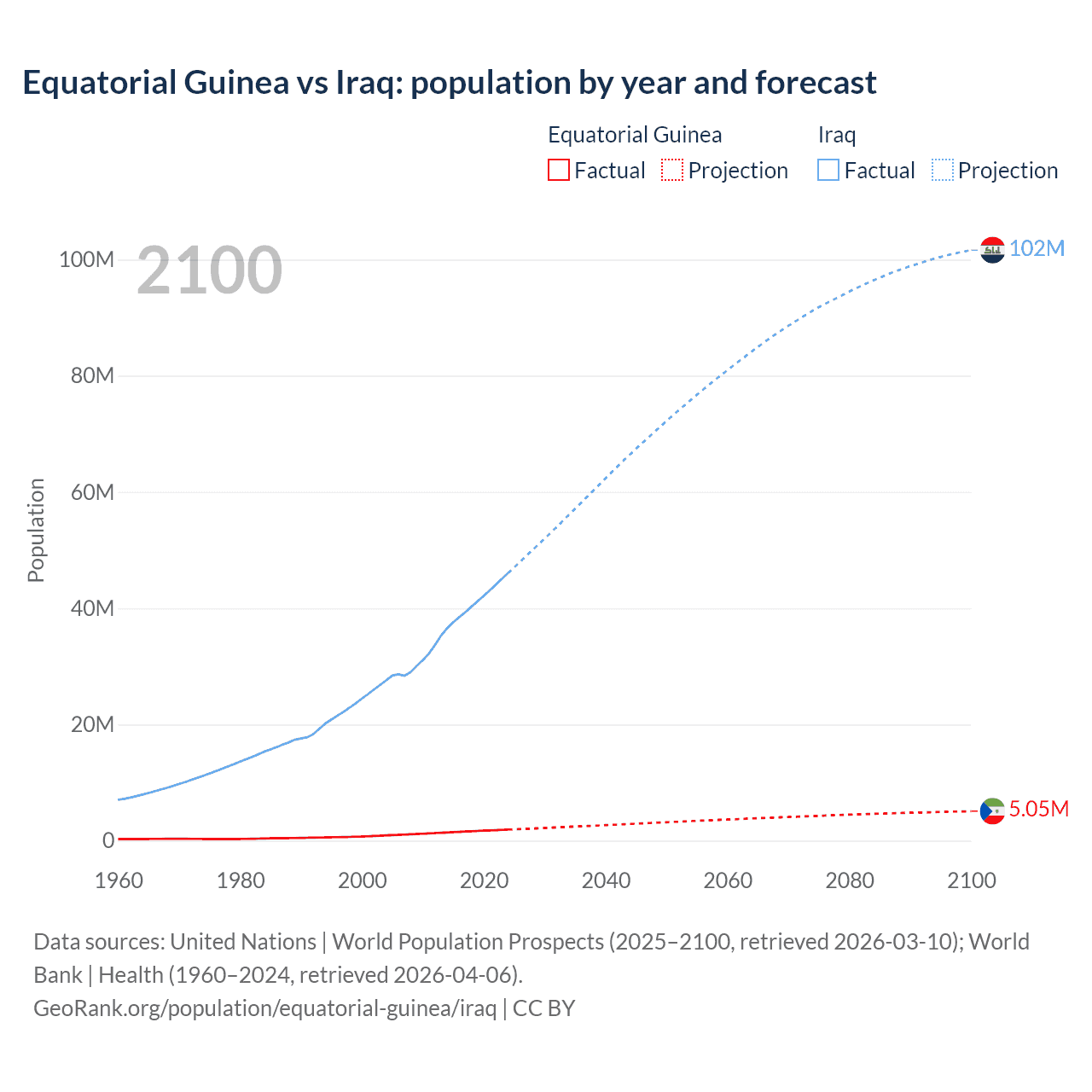 The latest officially reported population of Equatorial Guinea was 1,892,516 in 2024 vs 46,042,015 people in Iraq in 2024. In 2026, based on the adjusted UN estimation, the current Equatorial Guinea's population is 1,998,075 people compared to 48,289,334 in Iraq.
