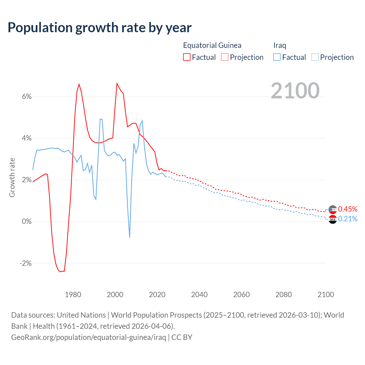 - For the last 10 years, Equatorial Guinea has had an average growth rate of +3.15% per year vs +2.45% in Iraq.