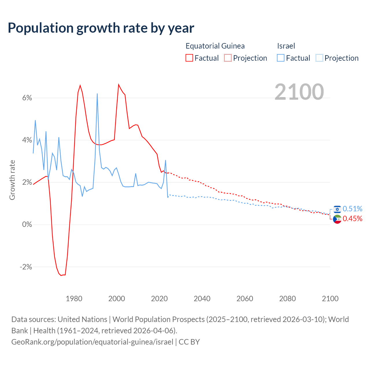 - For the last 10 years, Equatorial Guinea has had an average growth rate of +3.15% per year vs +1.96% in Israel.