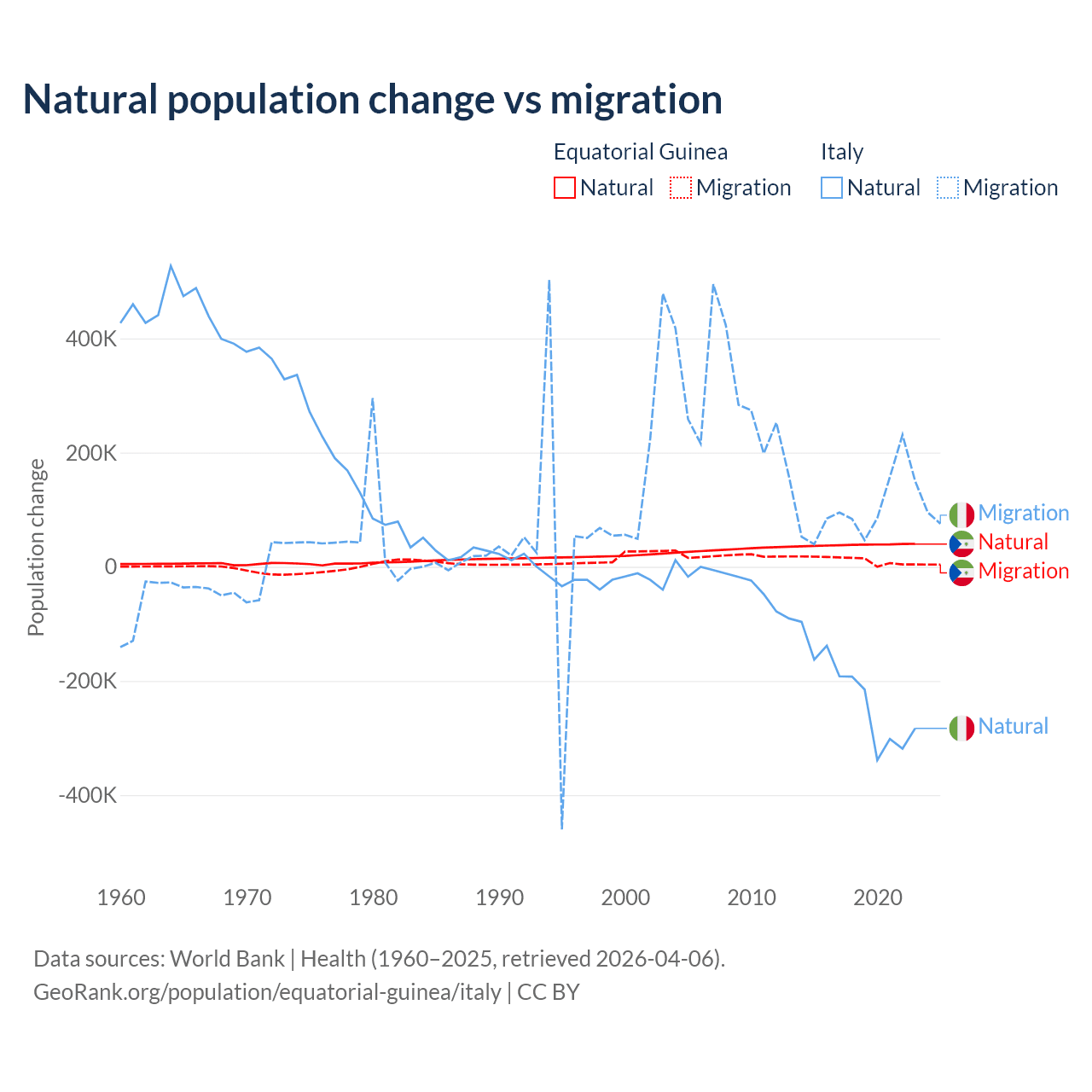Over the last 10 years, 77% of the population change in Equatorial Guinea is from natural causes (a gain of 382,745 people) and 23% is from migration (a gain of 114,024 people). In Italy 68.6% is from natural causes (a loss of 2,239,084 people) and 31.4% is from migration (a gain of 1,026,128 people).