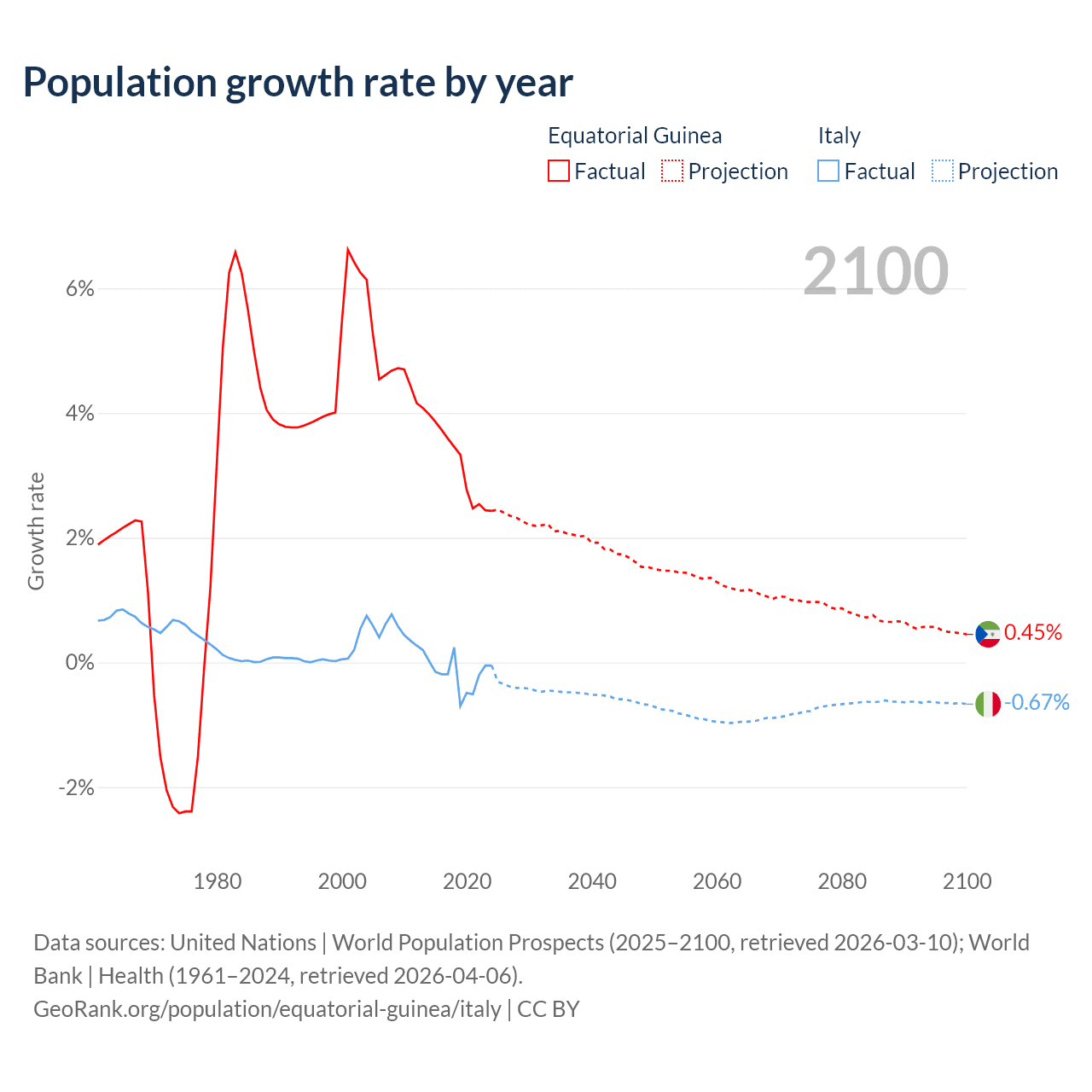 - For the last 10 years, Equatorial Guinea has had an average growth rate of +3.15% per year vs -0.21% in Italy.