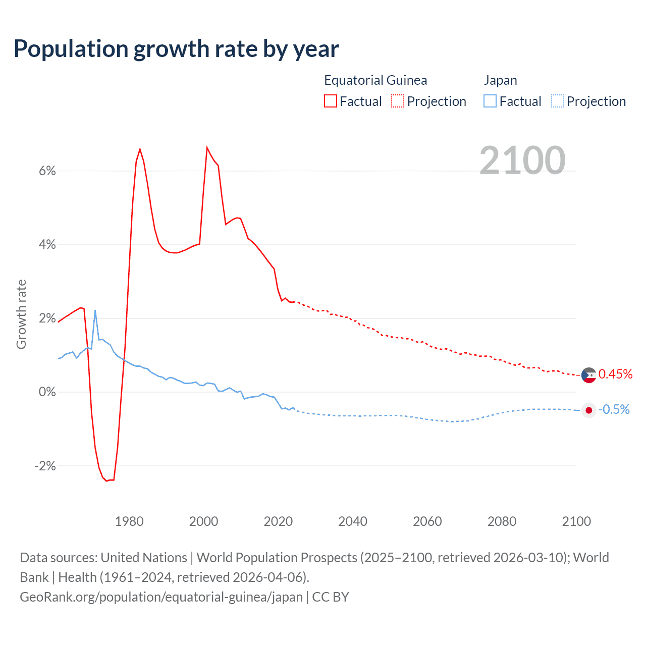- For the last 10 years, Equatorial Guinea has had an average growth rate of +3.15% per year vs -0.25% in Japan.