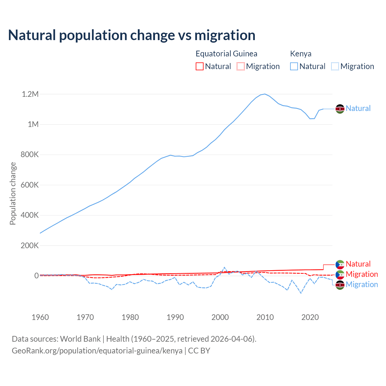 Over the last 10 years, 77% of the population change in Equatorial Guinea is from natural causes (a gain of 382,745 people) and 23% is from migration (a gain of 114,024 people). In Kenya 95.3% is from natural causes (a gain of 10,892,362 people) and 4.67% is from migration (a loss of 533,876 people).