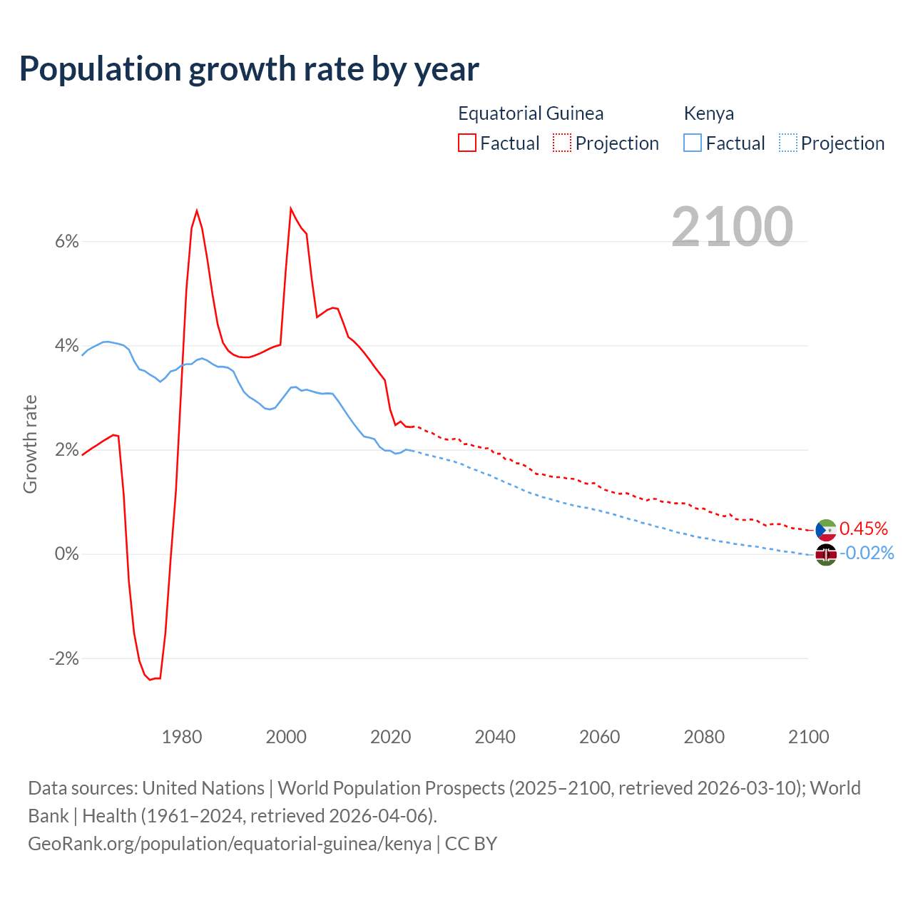 - For the last 10 years, Equatorial Guinea has had an average growth rate of +3.15% per year vs +2.08% in Kenya.