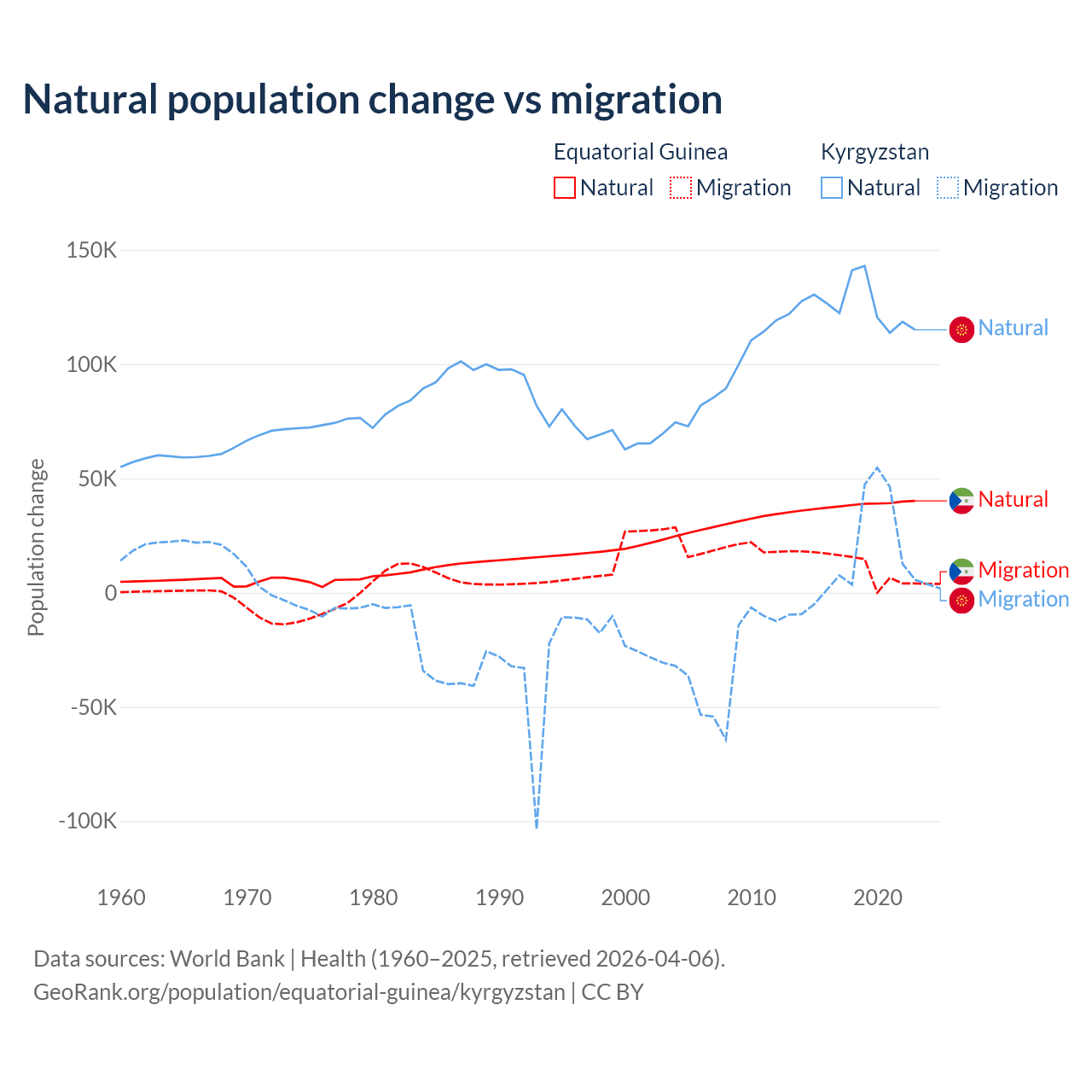 Over the last 10 years, 77% of the population change in Equatorial Guinea is from natural causes (a gain of 382,745 people) and 23% is from migration (a gain of 114,024 people). In Kyrgyzstan 88.5% is from natural causes (a gain of 1,258,837 people) and 11.5% is from migration (a gain of 164,132 people).