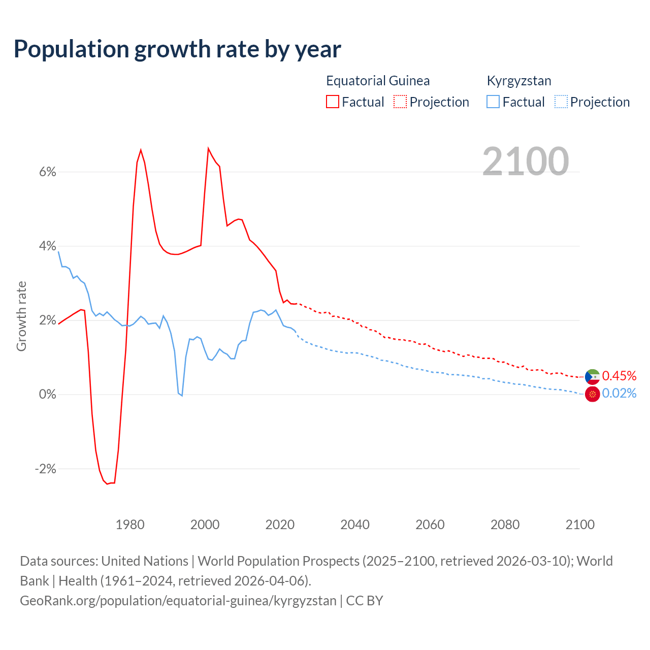 - For the last 10 years, Equatorial Guinea has had an average growth rate of +3.15% per year vs +2.05% in Kyrgyzstan.