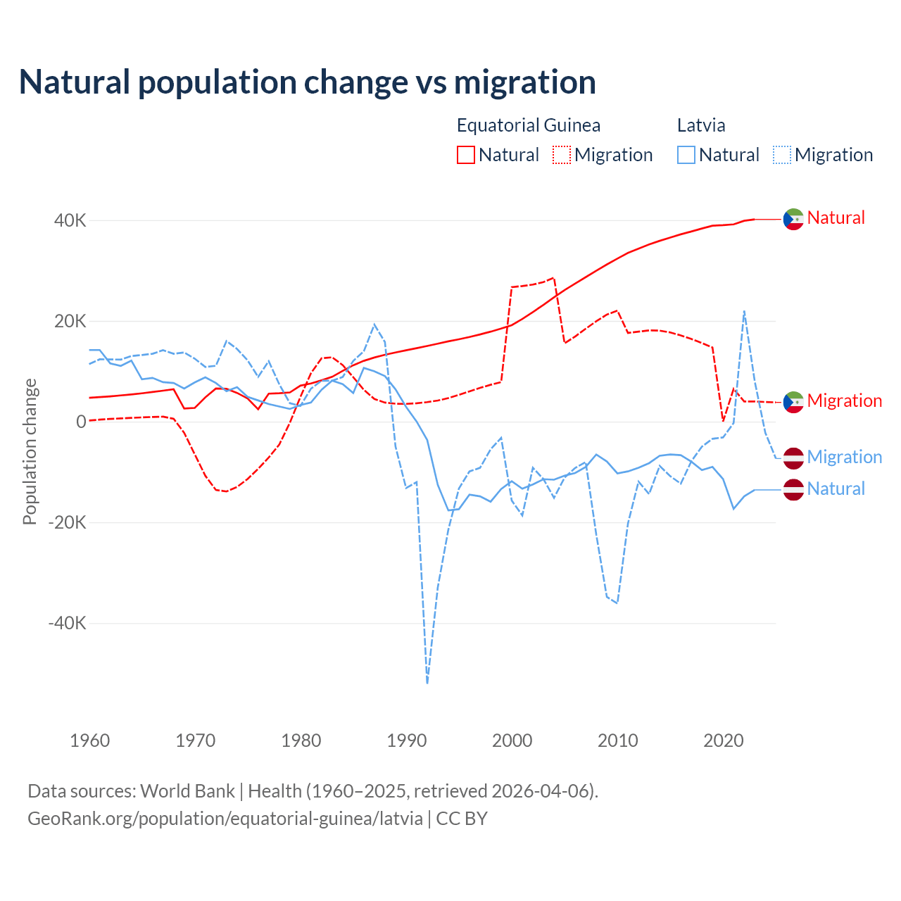 Over the last 10 years, 77% of the population change in Equatorial Guinea is from natural causes (a gain of 382,745 people) and 23% is from migration (a gain of 114,024 people). In Latvia 82.7% is from natural causes (a loss of 103,711 people) and 17.3% is from migration (a loss of 21,641 people).
