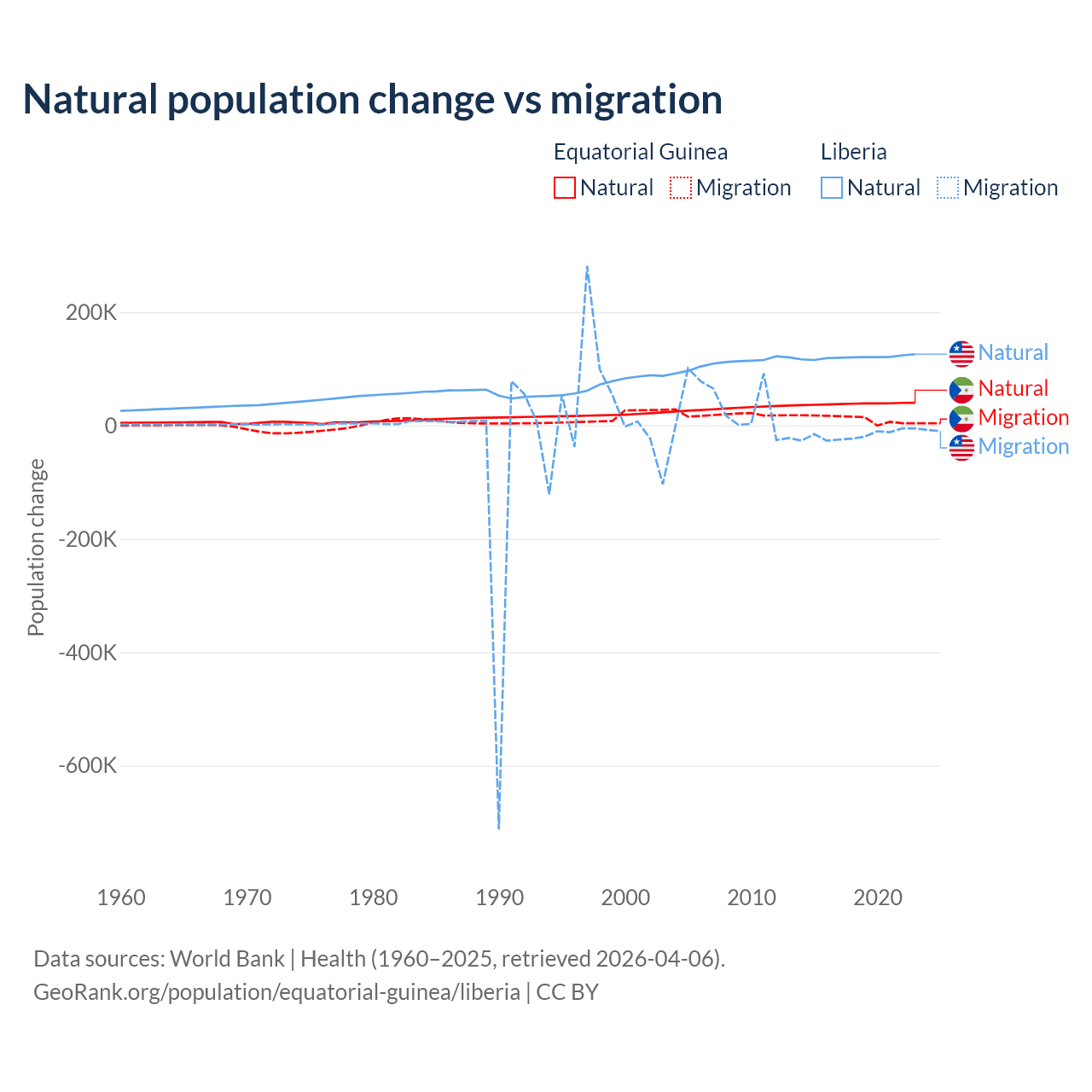Over the last 10 years, 77% of the population change in Equatorial Guinea is from natural causes (a gain of 382,745 people) and 23% is from migration (a gain of 114,024 people). In Liberia 87.7% is from natural causes (a gain of 1,202,387 people) and 12.3% is from migration (a loss of 168,316 people).
