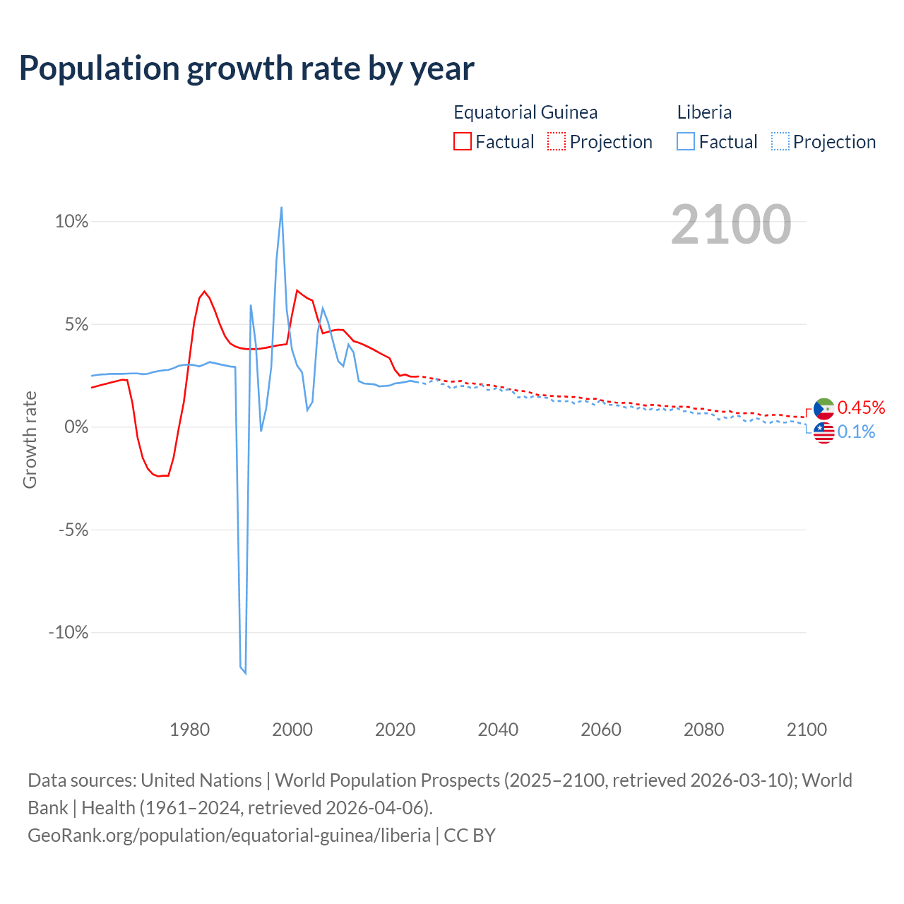 - For the last 10 years, Equatorial Guinea has had an average growth rate of +3.15% per year vs +2.09% in Liberia.