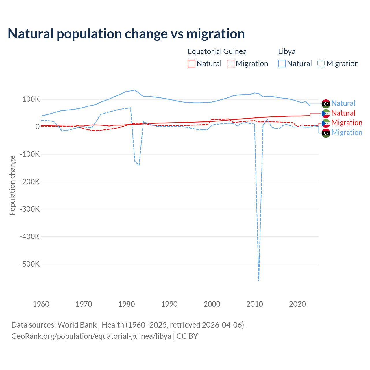 Over the last 10 years, 77% of the population change in Equatorial Guinea is from natural causes (a gain of 382,745 people) and 23% is from migration (a gain of 114,024 people). In Libya 99.4% is from natural causes (a gain of 975,799 people) and 0.63% is from migration (a loss of 6,150 people).