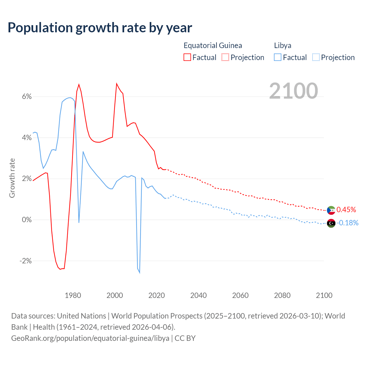 - For the last 10 years, Equatorial Guinea has had an average growth rate of +3.15% per year vs +1.44% in Libya.