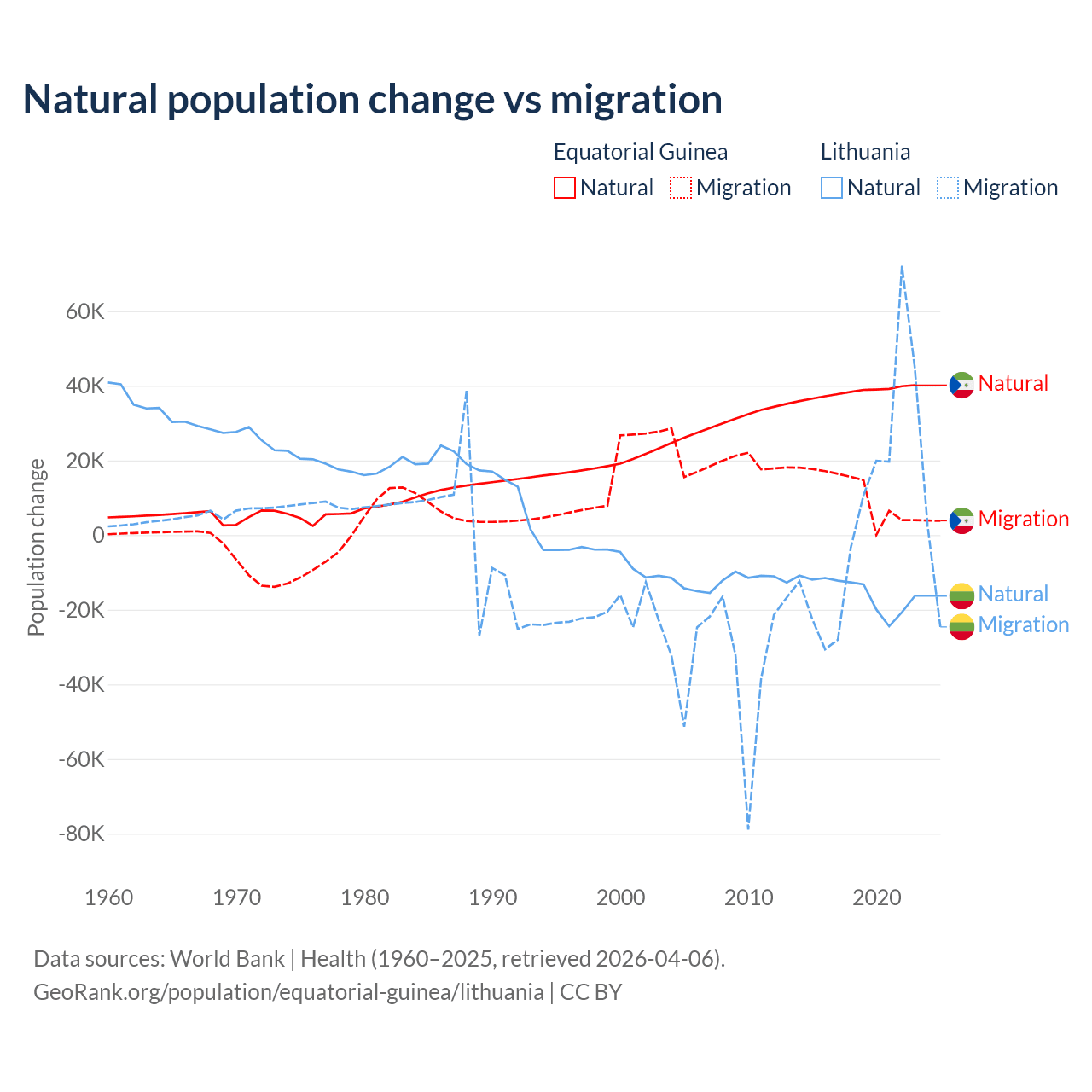 Over the last 10 years, 77% of the population change in Equatorial Guinea is from natural causes (a gain of 382,745 people) and 23% is from migration (a gain of 114,024 people). In Lithuania 68.7% is from natural causes (a loss of 153,859 people) and 31.3% is from migration (a gain of 70,196 people).