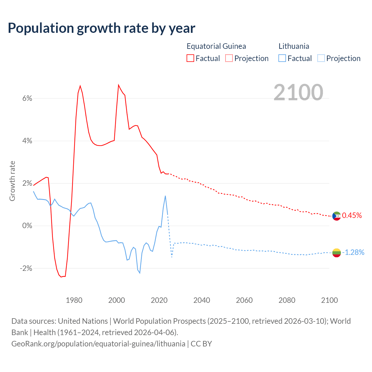 - For the last 10 years, Equatorial Guinea has had an average growth rate of +3.15% per year vs -0.22% in Lithuania.