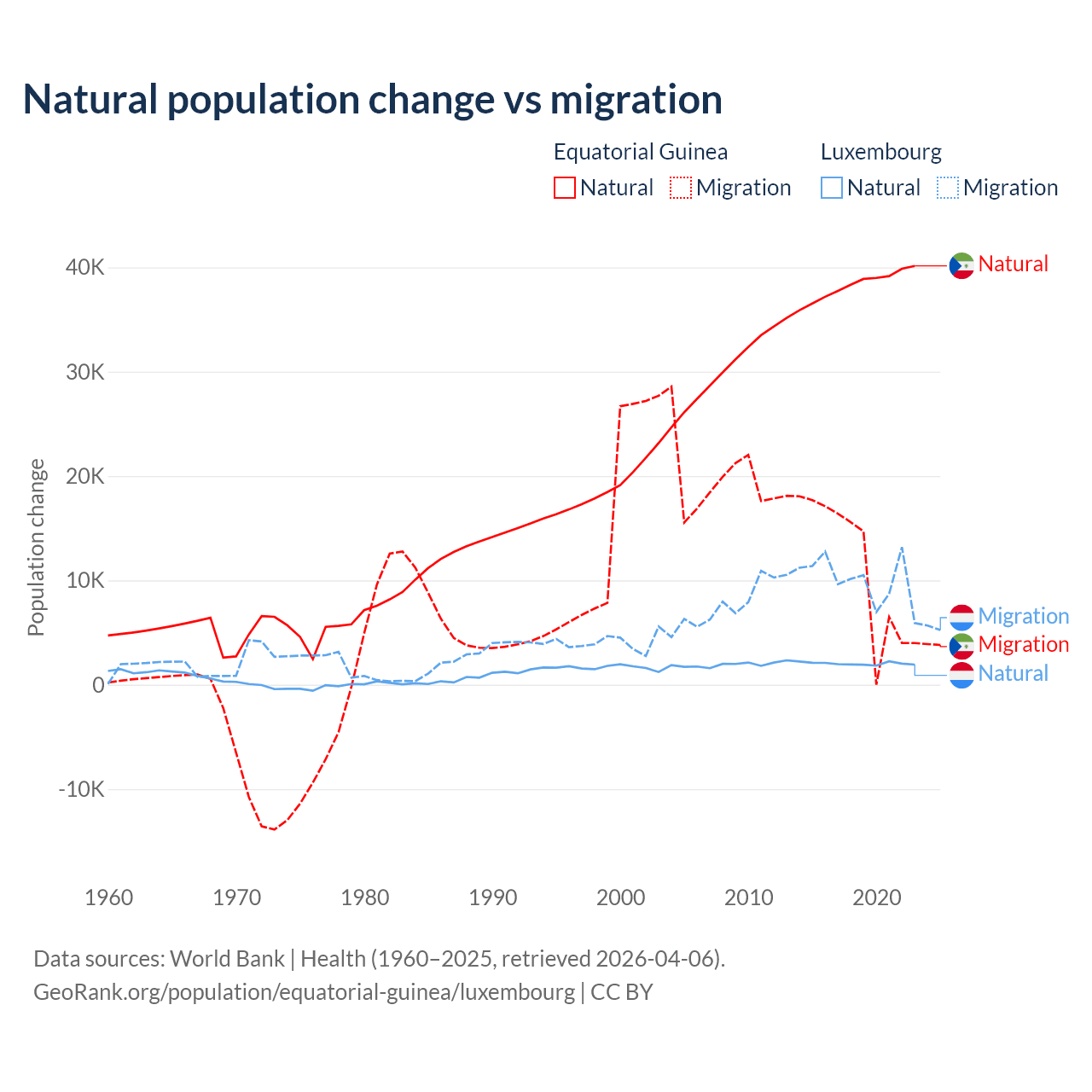 Over the last 10 years, 77% of the population change in Equatorial Guinea is from natural causes (a gain of 382,745 people) and 23% is from migration (a gain of 114,024 people). In Luxembourg 16.8% is from natural causes (a gain of 20,287 people) and 83.2% is from migration (a gain of 100,435 people).