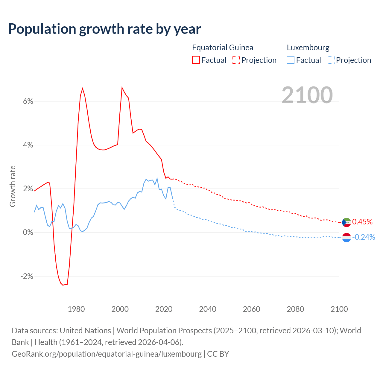 Data sources: World Bank | Health (1960–2024, retrieved 2026-04-06); United Nations | World Population Prospects (1960–2026, retrieved 2026-03-10); U.S. Census Bureau (1960–2025, retrieved 2026-02-08); Central Intelligence Agency (CIA) (2000–2019, retrieved 2026-02-20).