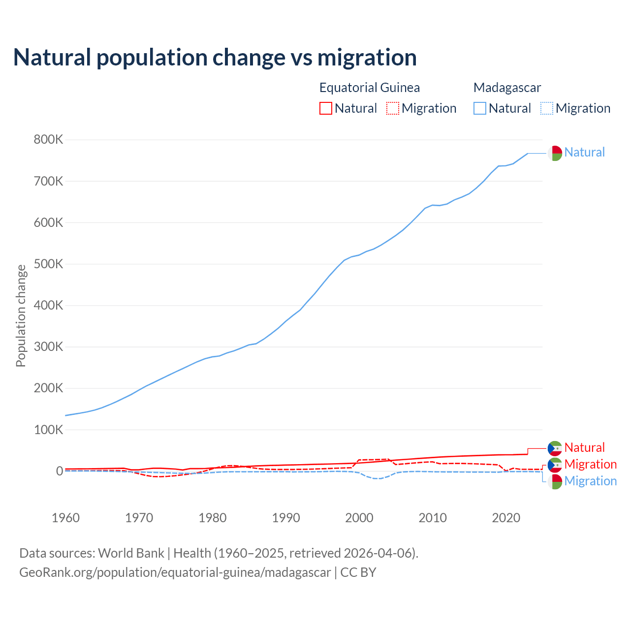 Over the last 10 years, 77% of the population change in Equatorial Guinea is from natural causes (a gain of 382,745 people) and 23% is from migration (a gain of 114,024 people). In Madagascar 99.7% is from natural causes (a gain of 7,165,578 people) and 0.31% is from migration (a loss of 22,384 people).