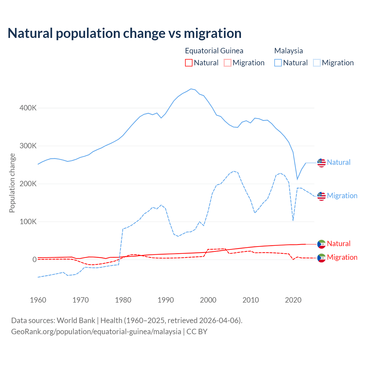 Over the last 10 years, 77% of the population change in Equatorial Guinea is from natural causes (a gain of 382,745 people) and 23% is from migration (a gain of 114,024 people). In Malaysia 61.7% is from natural causes (a gain of 3,029,648 people) and 38.3% is from migration (a gain of 1,882,159 people).