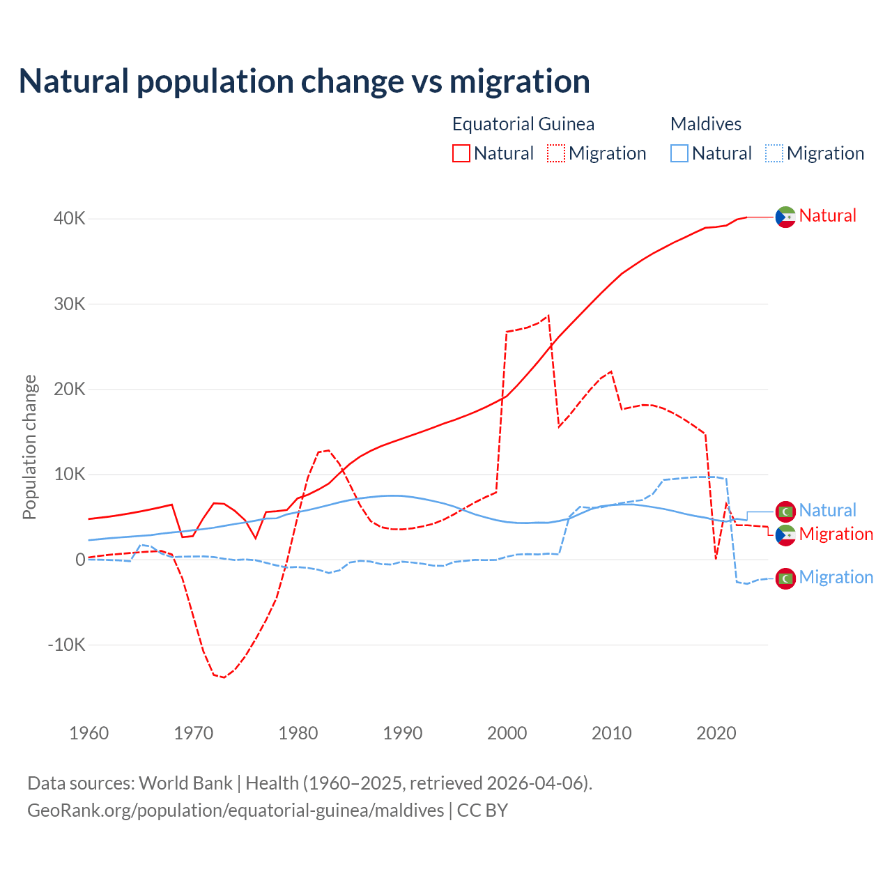 Over the last 10 years, 77% of the population change in Equatorial Guinea is from natural causes (a gain of 382,745 people) and 23% is from migration (a gain of 114,024 people). In Maldives 42.7% is from natural causes (a gain of 51,342 people) and 57.3% is from migration (a gain of 68,788 people).