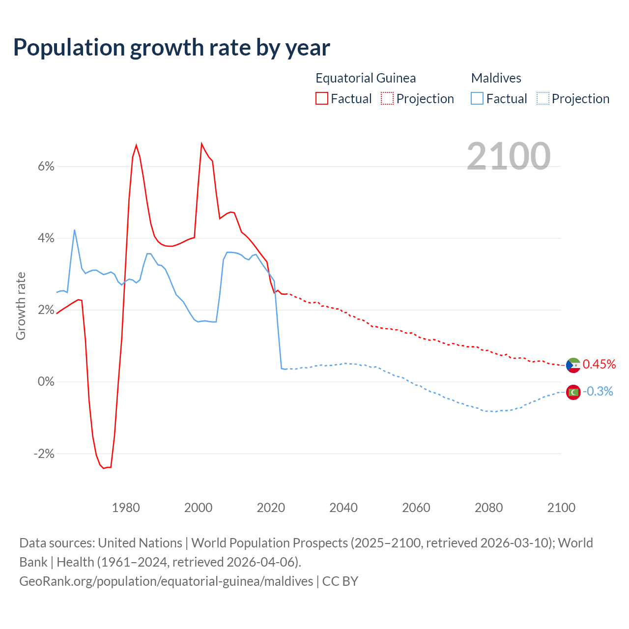 Data sources: World Bank | Health (1960–2024, retrieved 2026-04-06); United Nations | World Population Prospects (1960–2026, retrieved 2026-03-10); U.S. Census Bureau (1960–2025, retrieved 2026-02-08); Central Intelligence Agency (CIA) (2000–2019, retrieved 2026-02-20).