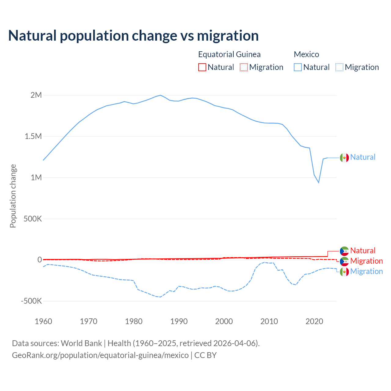 Over the last 10 years, 77% of the population change in Equatorial Guinea is from natural causes (a gain of 382,745 people) and 23% is from migration (a gain of 114,024 people). In Mexico 87.5% is from natural causes (a gain of 13,080,136 people) and 12.5% is from migration (a loss of 1,876,544 people).