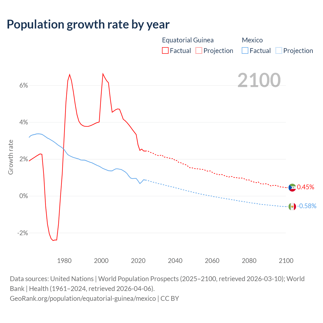 - For the last 10 years, Equatorial Guinea has had an average growth rate of +3.15% per year vs +0.92% in Mexico.
