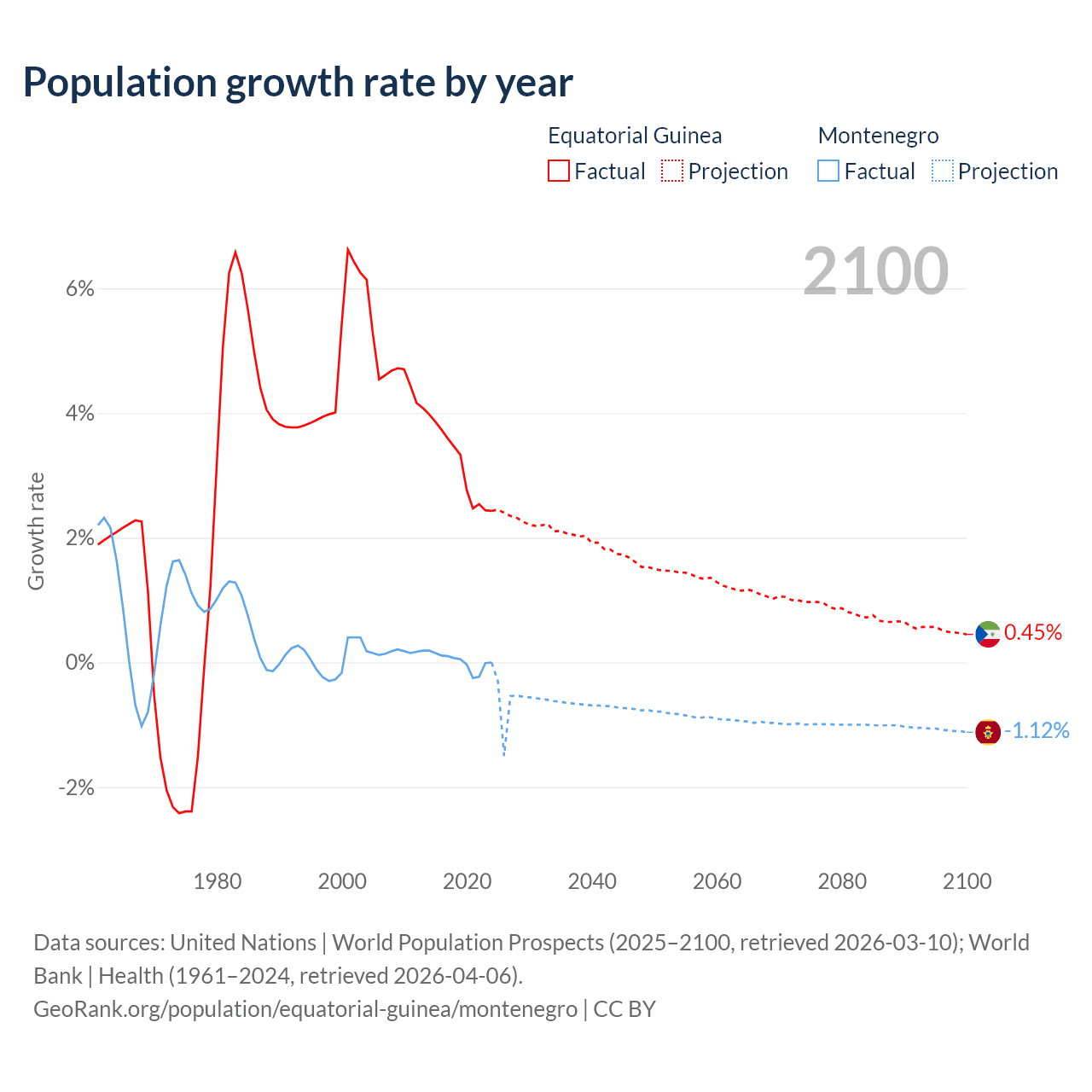 Data sources: World Bank | Health (1960–2024, retrieved 2026-04-06); United Nations | World Population Prospects (1960–2026, retrieved 2026-03-10); U.S. Census Bureau (1960–2025, retrieved 2026-02-08); Central Intelligence Agency (CIA) (2000–2019, retrieved 2026-02-20).