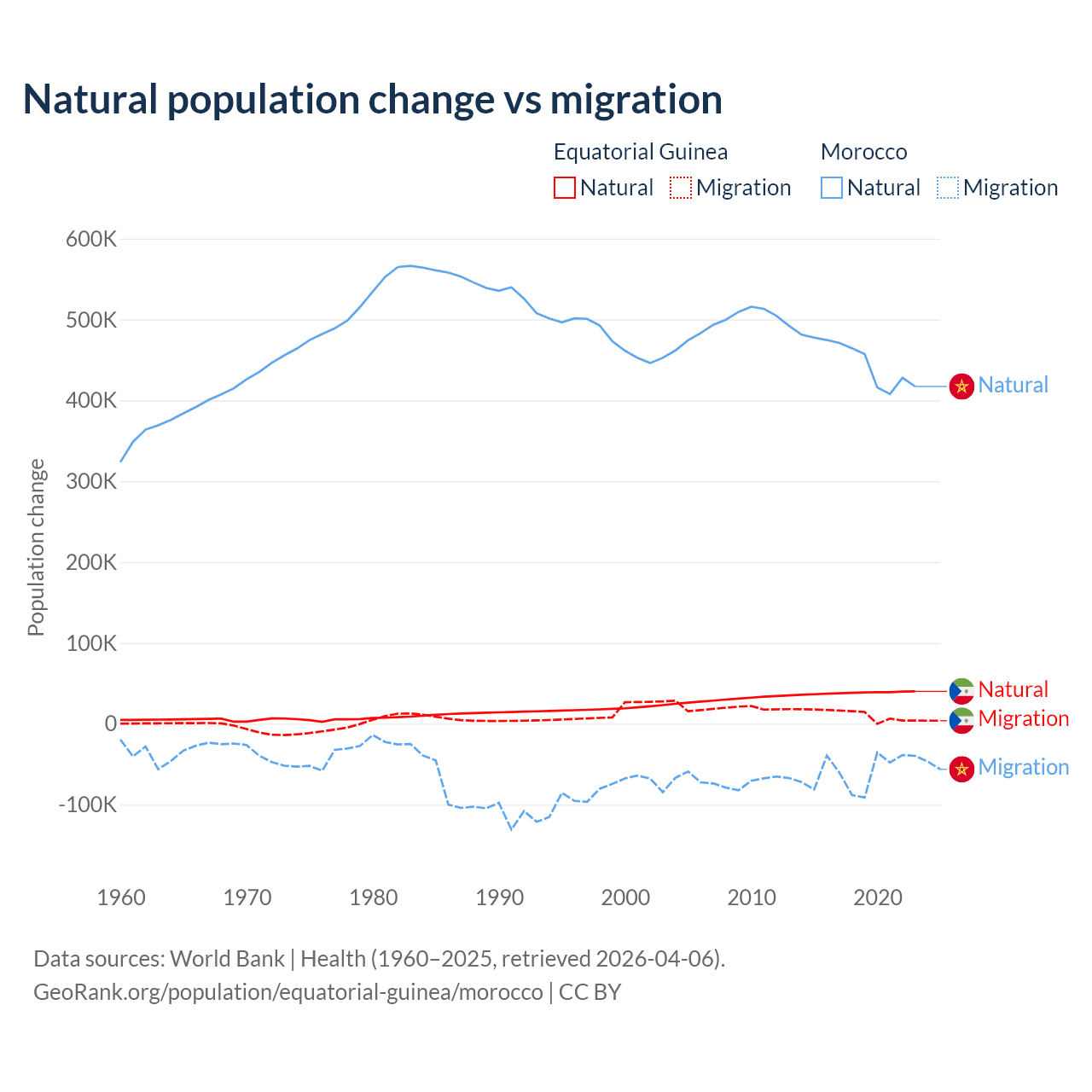 Over the last 10 years, 77% of the population change in Equatorial Guinea is from natural causes (a gain of 382,745 people) and 23% is from migration (a gain of 114,024 people). In Morocco 88.3% is from natural causes (a gain of 4,495,223 people) and 11.7% is from migration (a loss of 594,083 people).