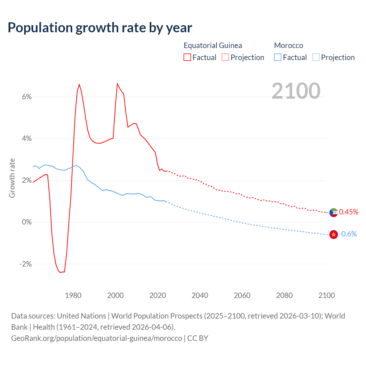 - For the last 10 years, Equatorial Guinea has had an average growth rate of +3.15% per year vs +1.09% in Morocco.