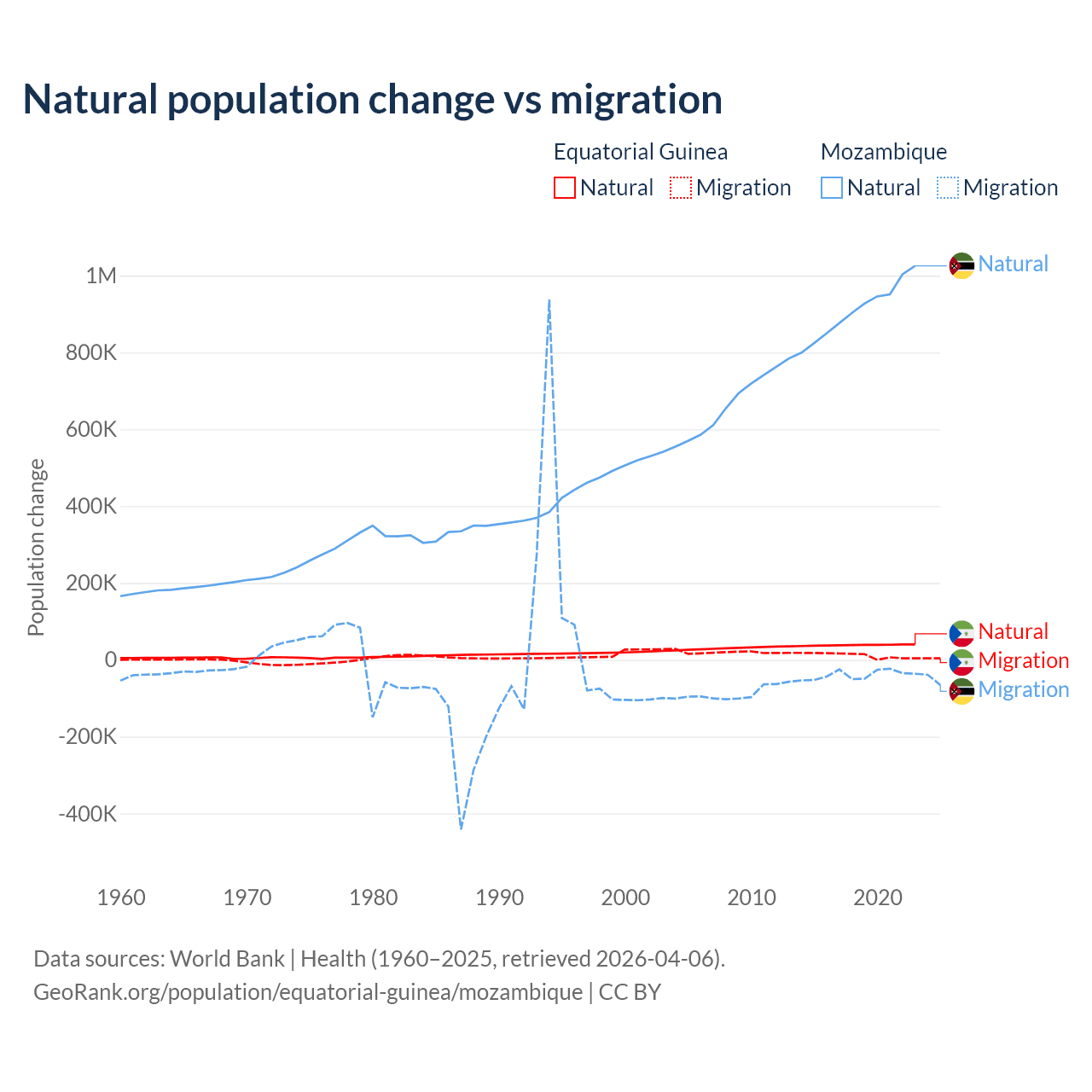 Over the last 10 years, 77% of the population change in Equatorial Guinea is from natural causes (a gain of 382,745 people) and 23% is from migration (a gain of 114,024 people). In Mozambique 95.9% is from natural causes (a gain of 9,108,203 people) and 4.15% is from migration (a loss of 393,923 people).