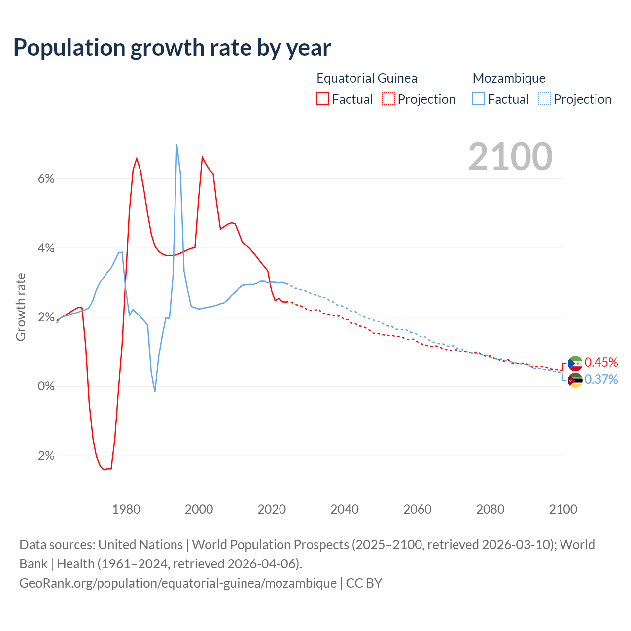 - For the last 10 years, Equatorial Guinea has had an average growth rate of +3.15% per year vs +2.99% in Mozambique.