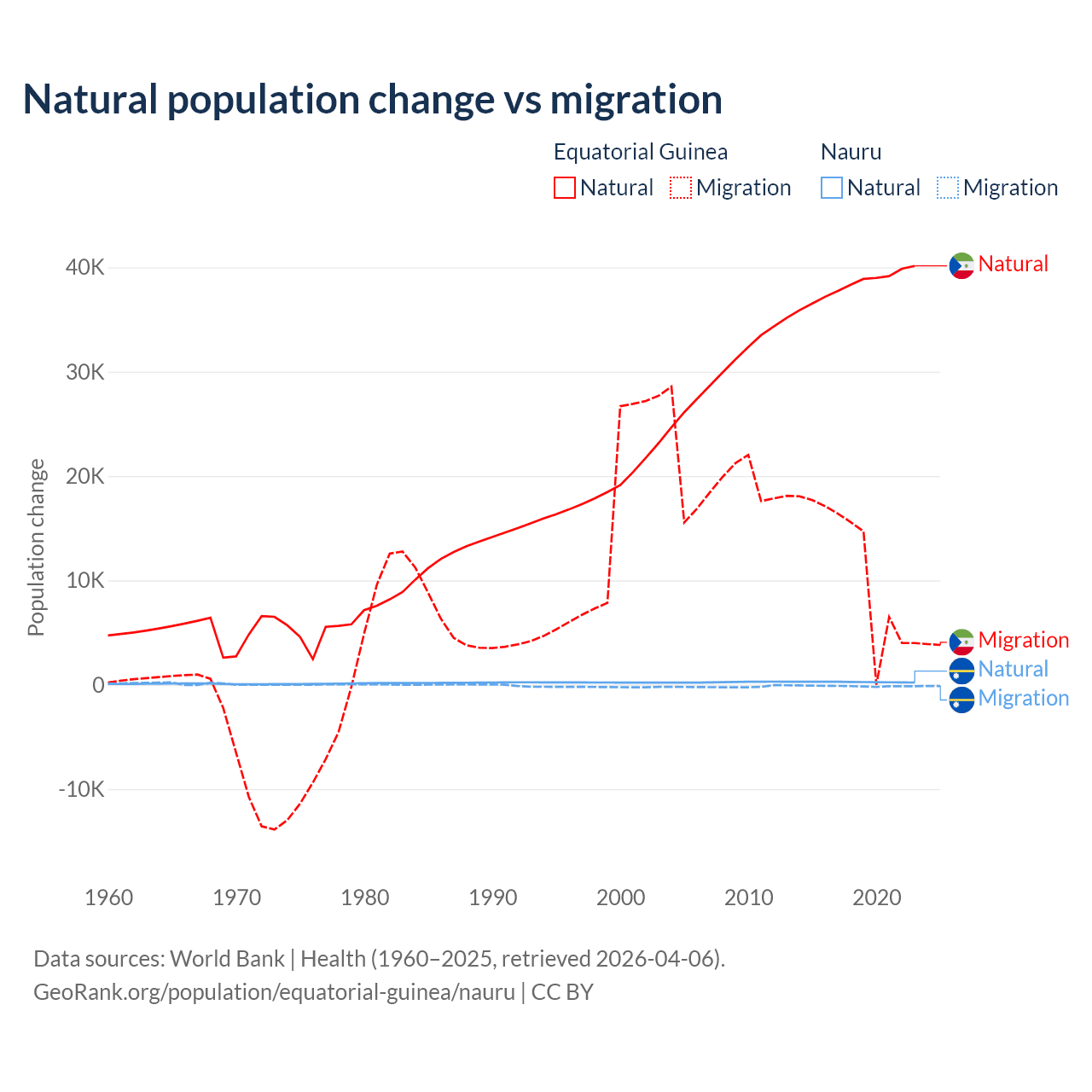 Over the last 10 years, 77% of the population change in Equatorial Guinea is from natural causes (a gain of 382,745 people) and 23% is from migration (a gain of 114,024 people). In Nauru 66.2% is from natural causes (a gain of 2,590 people) and 33.8% is from migration (a loss of 1,320 people).