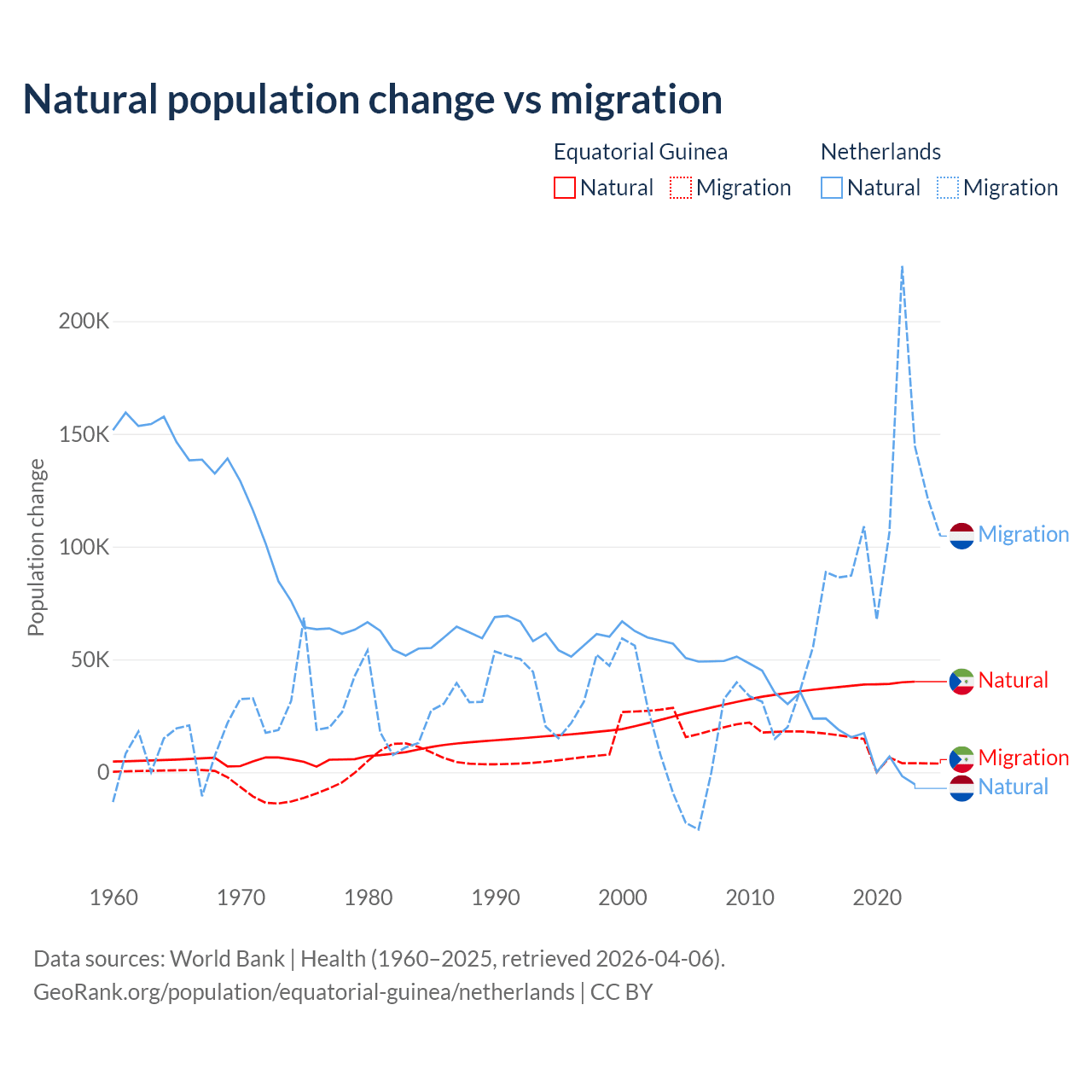 Over the last 10 years, 77% of the population change in Equatorial Guinea is from natural causes (a gain of 382,745 people) and 23% is from migration (a gain of 114,024 people). In the Netherlands 11.8% is from natural causes (a gain of 134,554 people) and 88.2% is from migration (a gain of 1,006,495 people).