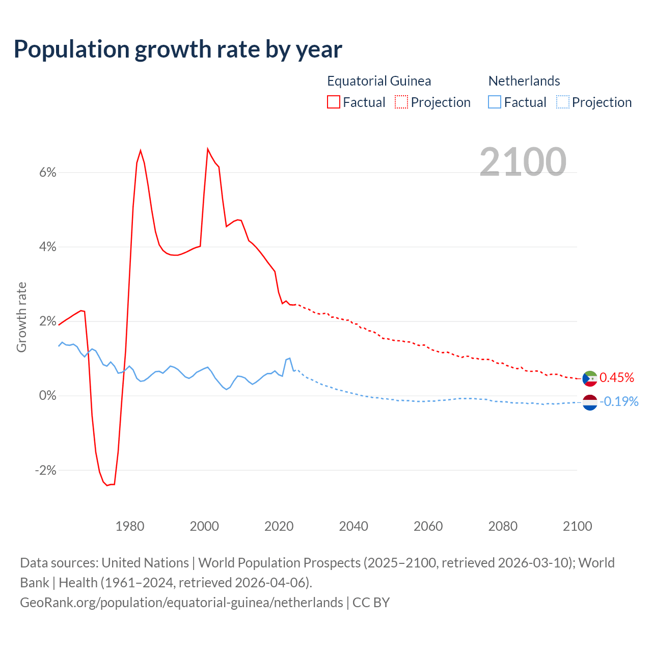 - For the last 10 years, Equatorial Guinea has had an average growth rate of +3.15% per year vs +0.62% in the Netherlands.